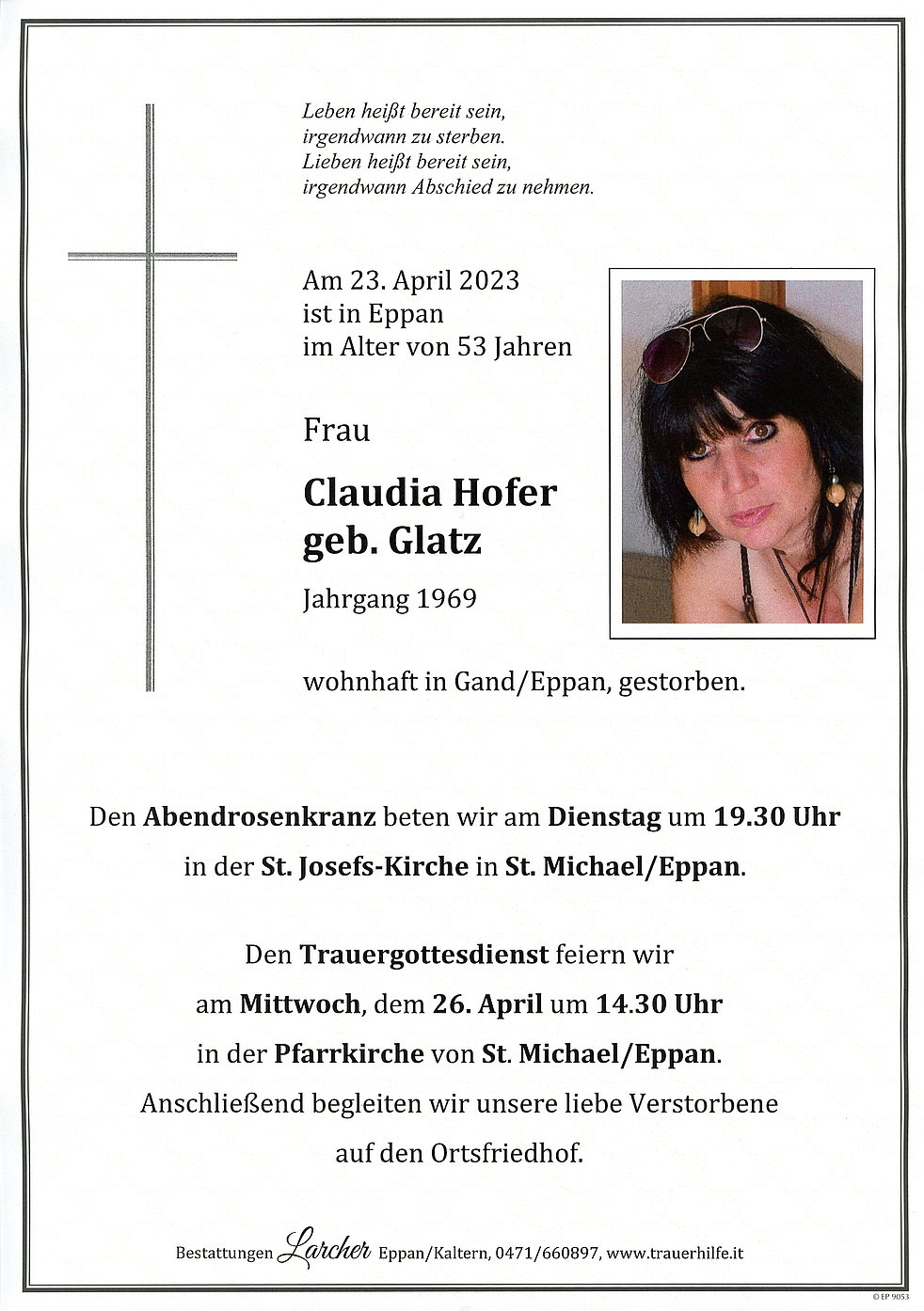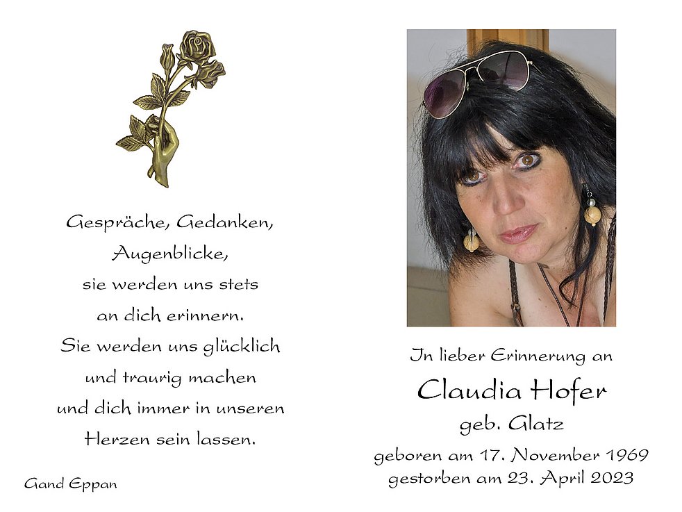 Den Abschiedsgottesdienst feiern wir am Mittwoch, dem 26. April um 14.30 Uhr in der Pfarrkirche von St. Michael/Eppan. Anschließend begleiten wir unsere liebe Verstorbene auf den Ortsfriedhof.