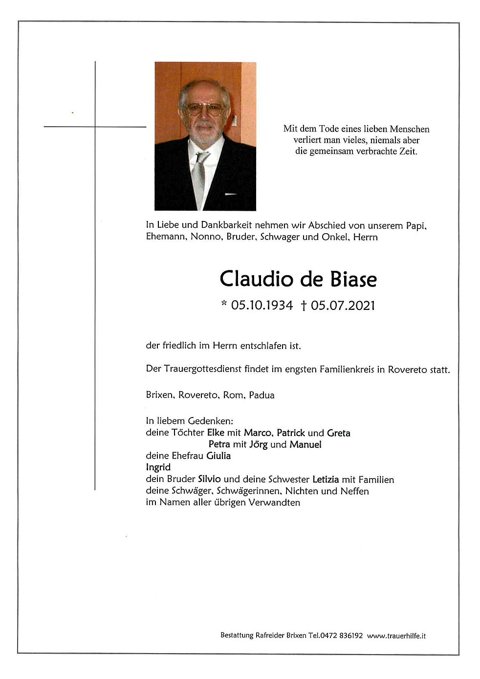 Der Trauergottesdienst findet im engsten Familienkreis in Rovereto statt.