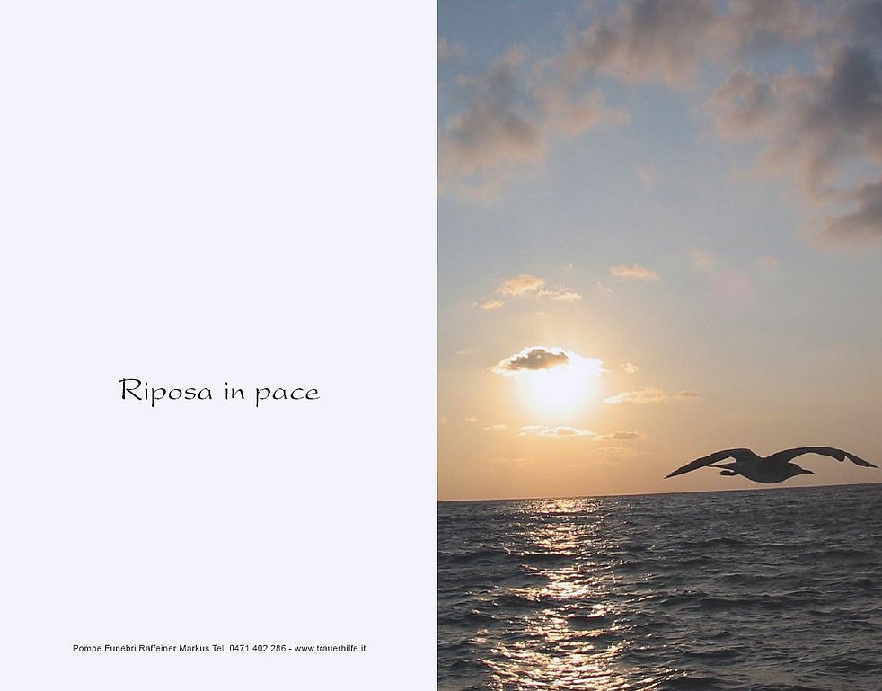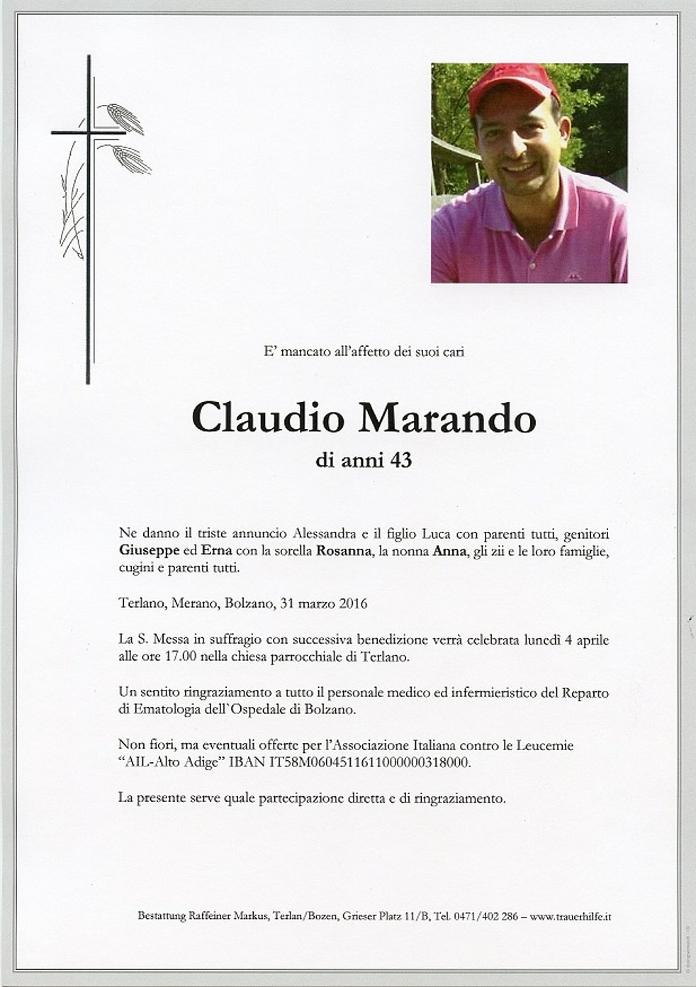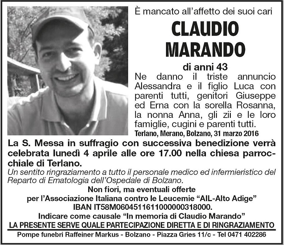 Non fiori, ma eventuali offerte per l’Associazione Italiana contro le Leucemie “AIL-Alto Adige” IBAN IT58M0604511611000000318000