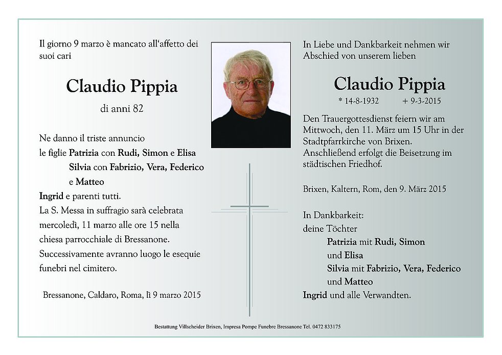 Den Trauergottesdienst feiern wir am Mittwoch, den 11. März um 15 Uhr in der Stadtpfarrkirche von Brixen.