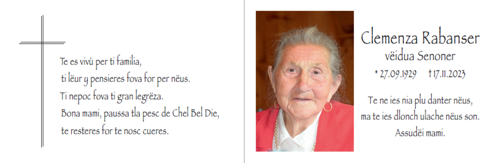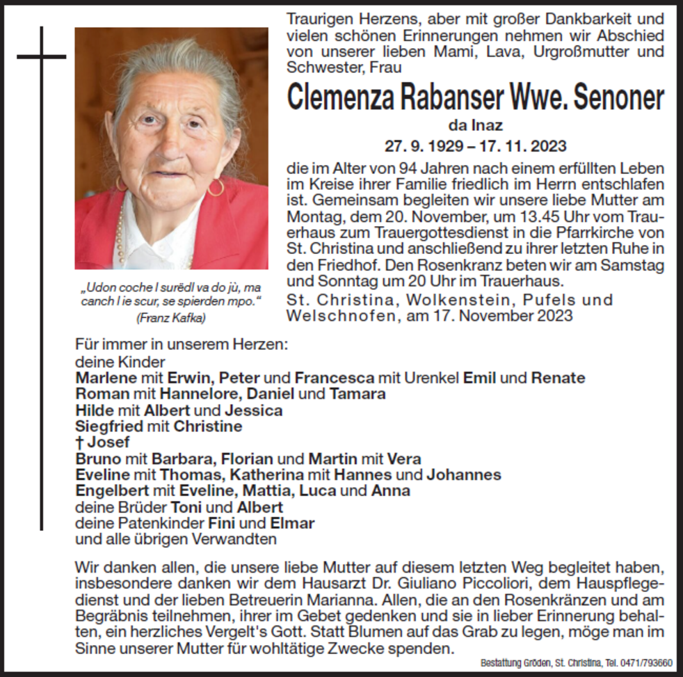 Wir danken allen, die unsere liebe Mutter auf diesem letzten Weg begleitet haben, insbesondere danken wir dem Hausarzt Dr. Giuliano Piccoliori, dem Hauspflegedienst und der lieben Betreuerin Marianna.