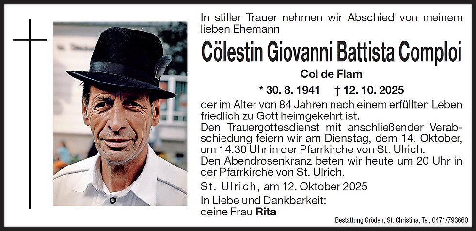 Den Trauergottesdienst mit anschließender Verabschiedung feiern wir am Dienstag, dem 14. Oktober, um 14.30 Uhr in der Pfarrkirche von St. Ulrich.