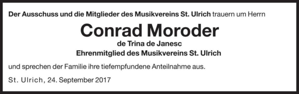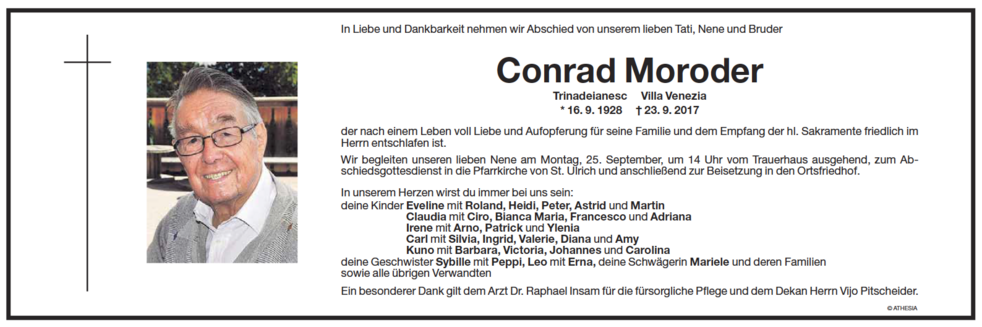Wir begleiten unseren lieben Nene am Montag, 25. September, um 14 Uhr vom Trauerhaus ausgehend, zum Abschiedsgottesdienst in die Pfarrkirche von St. Ulrich und anschließend zur Beisetzung in den Ortsfriedhof.