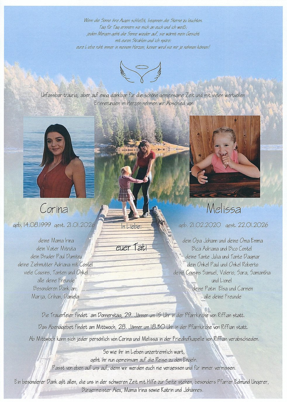 Ab Mittwoch kann sich jeder persönlich von Corina und Melissa in der Friedhofkapelle von Riffian verabschieden.