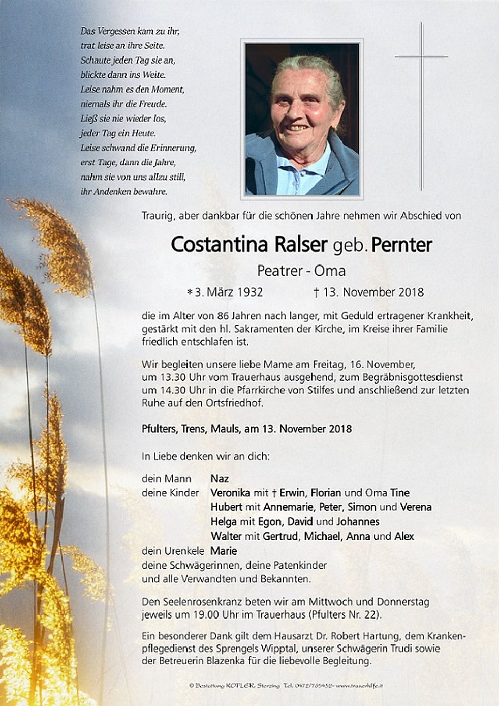 Wir begleiten unsere liebe Mame am Freitag, 16. November, um 13.30 Uhr vom Trauerhaus ausgehend, zum Begräbnisgottesdienst um 14.30 Uhr in die Pfarrkirche von Stilfes und anschließend zur letzten Ruhe auf den Ortsfriedhof.