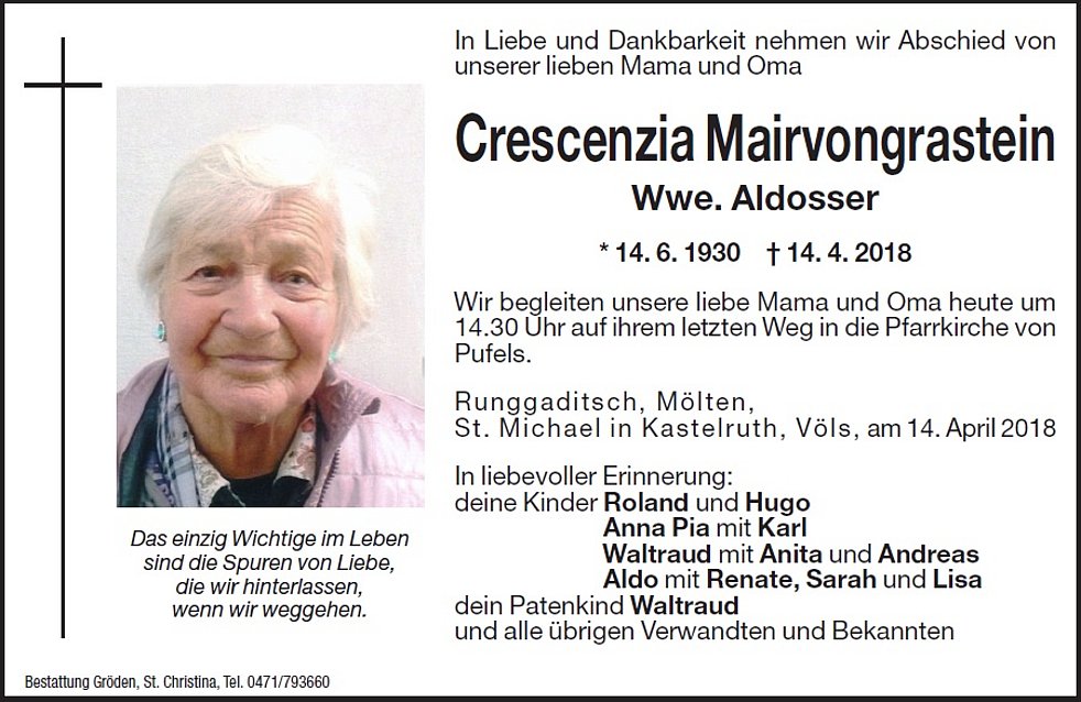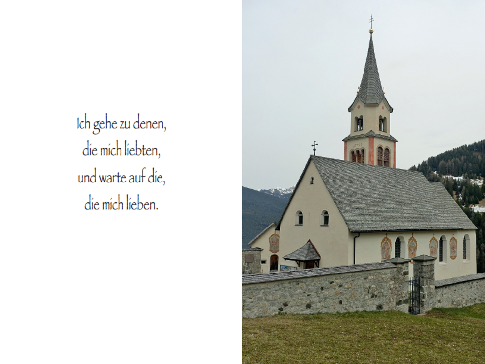 Wir begleiten unsere liebe Mama und Oma am Montag dem 16. April um 14.30 Uhr auf ihrem letzten Weg in die Pfarrkirche von Pufels.