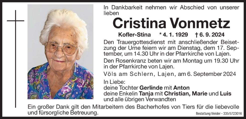 Den Trauergottesdienst mit anschließender Beisetzung der Urne feiern wir am Dienstag, dem 17. September um 14.30 Uhr in der Pfarrkirche von Lajen.