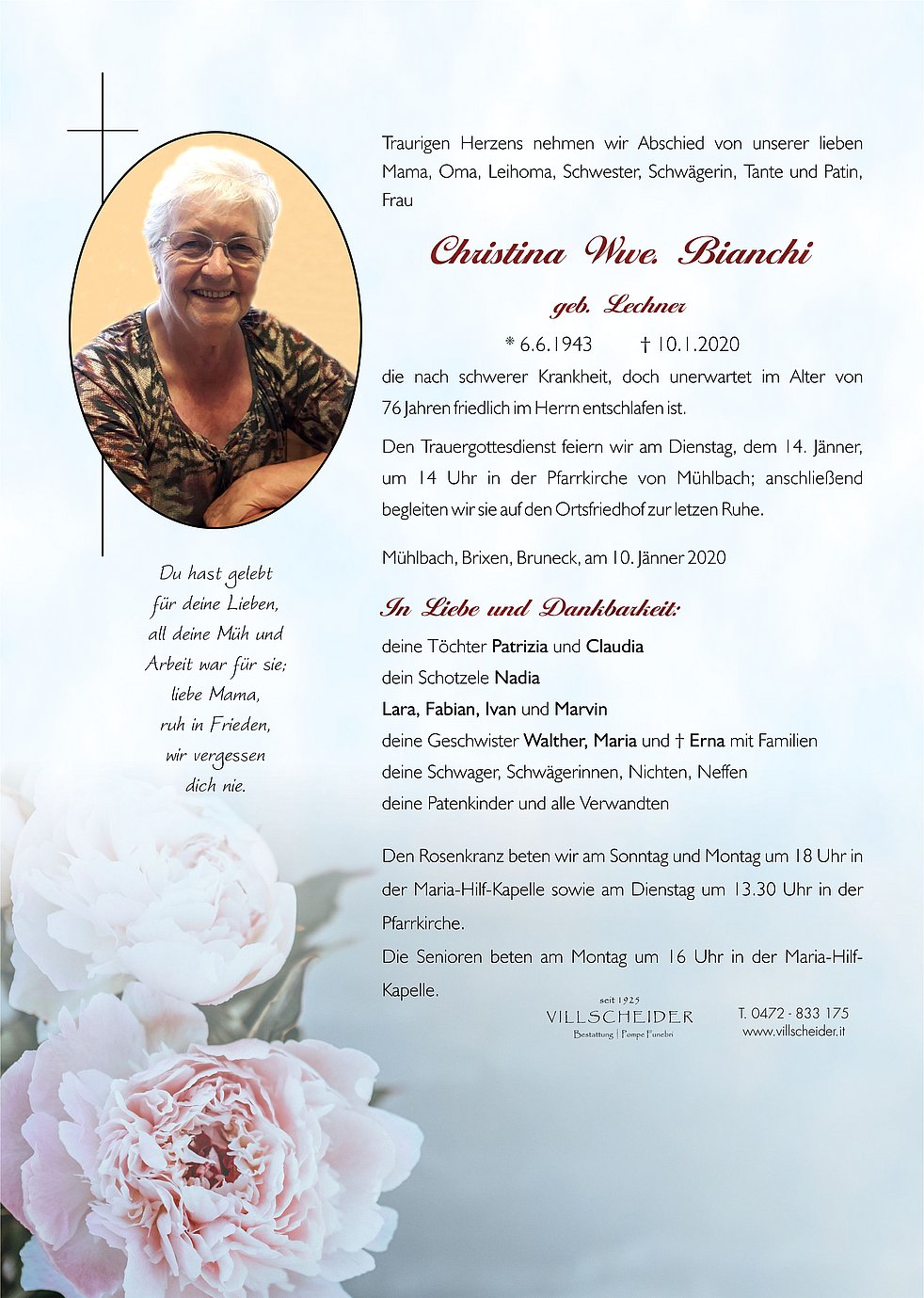 Liebe Claudia und Patrizia, I bin gonz geruehrt am Tode eurer lieben Mamma. Sie wor so a sgmpatische Frau und I wear sie gonz lieb in Erinnerung koltn.I wuensch enk beada gonz viel Kroft und I bin fuer enk do. Mein gonz groasses Beileid.
