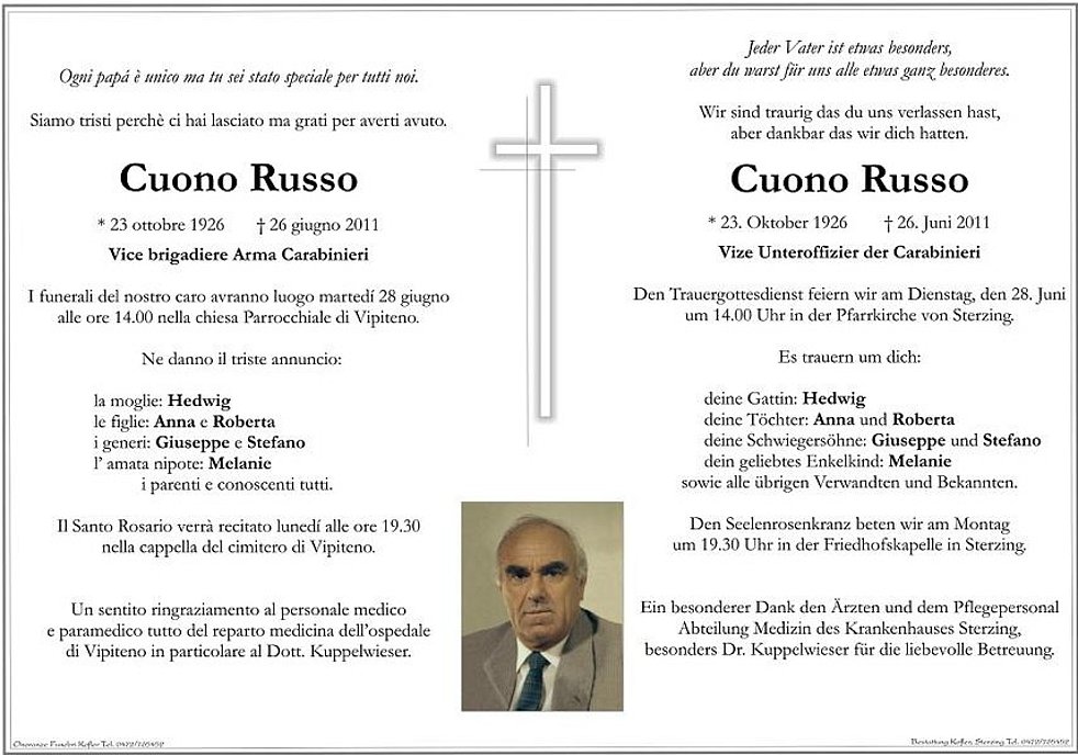 I funerali del nostro caro avranno luogo martedí 28 giugno