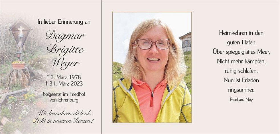 Unsere liebe Dagmar ist ab Samstagmittag in der Friedhofskapelle von Ehrenburg aufgebahrt. Gemeinsam beten wir den Rosenkranz am Samstag und am Sonntag um 18 Uhr sowie am Montag um 14 Uhr in der Pfarrkirche. Die Senioren beten am Sonntag um 14.30 Uhr.