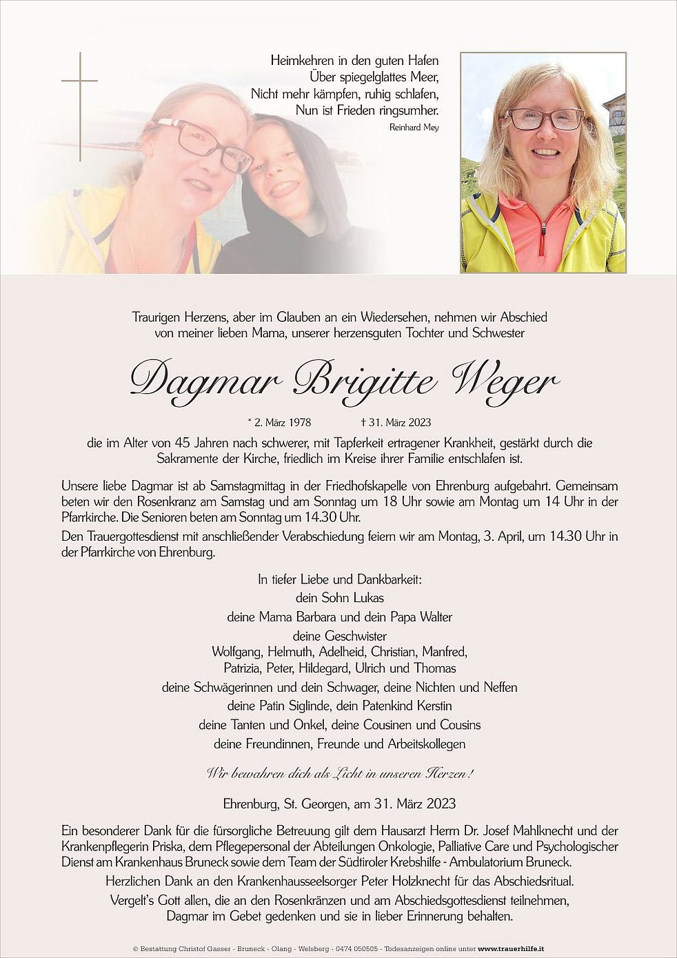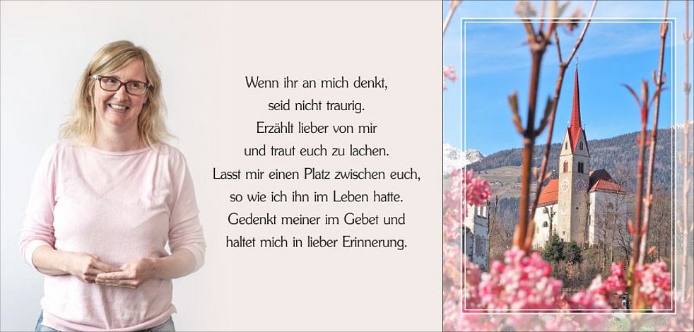 Ein besonderer Dank für die fürsorgliche Betreuung gilt dem Hausarzt Herrn Dr. Josef Mahlknecht und der Krankenpflegerin Priska, dem Pflegepersonal der Abteilungen Onkologie, Palliative Care und Psychologischer Dienst am Krankenhaus Bruneck sowie dem Team der Südtiroler Krebshilfe - Ambulatorium Bruneck.
