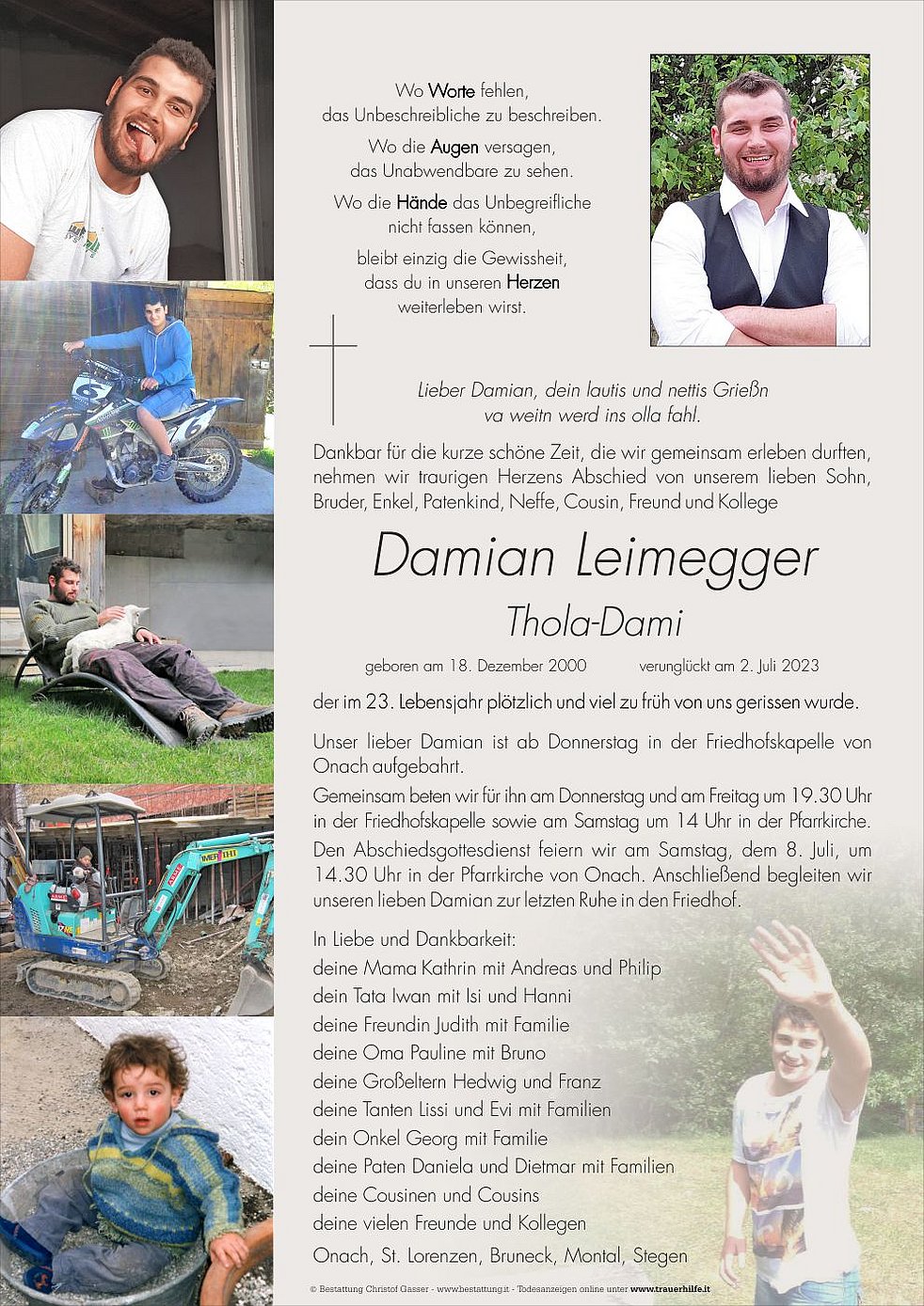 Den Abschiedsgottesdienst feiern wir am Samstag, dem 8. Juli, um 14.30 Uhr in der Pfarrkirche von Onach. Anschließend begleiten wir unseren lieben Damian zur letzten Ruhe in den Friedhof.