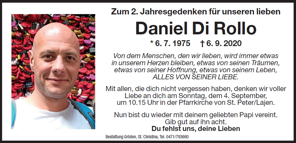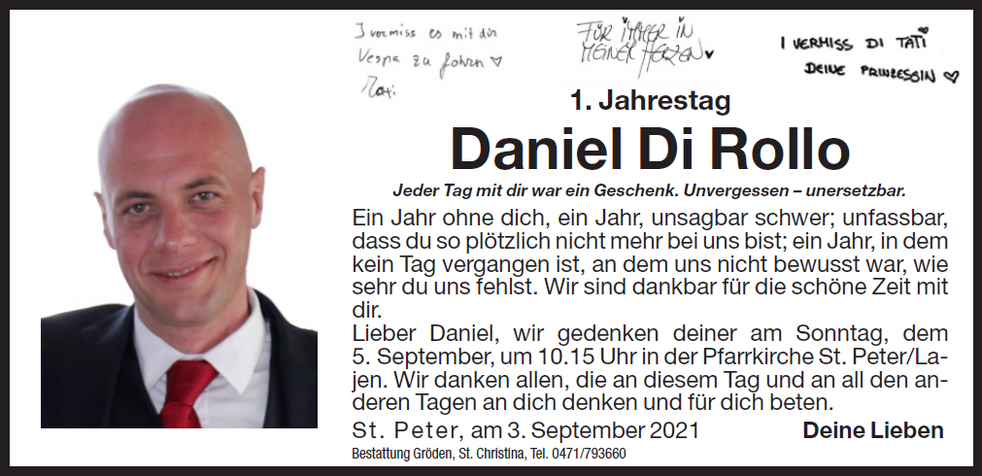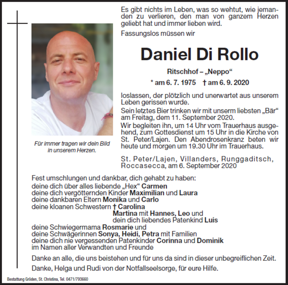 Sein letztes Bier trinken wir mit unserm liebsten „Bär“ am Freitag, dem 11. September 2020. Wir begleiten ihn, um 14 Uhr vom Trauerhaus ausgehend, zum Gottesdienst um 15 Uhr in die Kirche von St. Peter/Lajen.