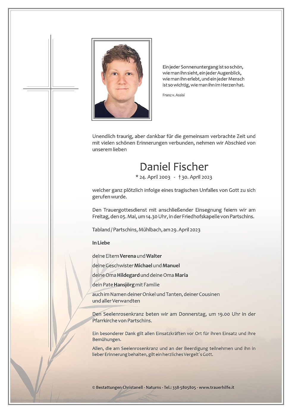 Den Trauergottesdienst mit anschließender Einsegnung feiern wir am Freitag, den 05. Mai, um 14.30 Uhr, in der Friedhofskapelle von Partschins.