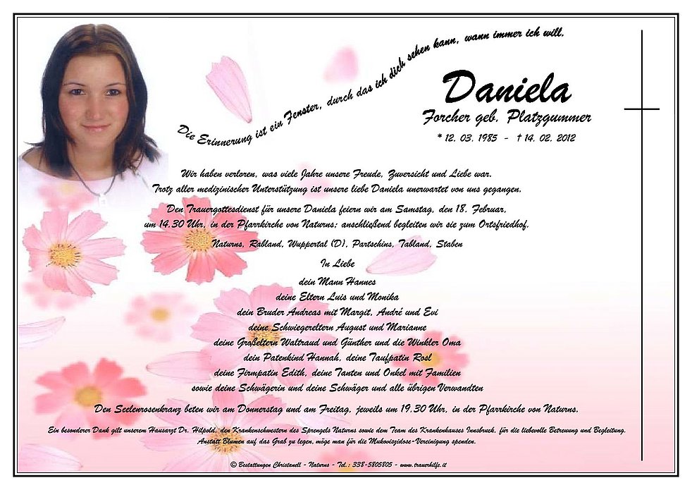 Den Trauergottesdienst für unsere Daniela feiern wir am Samstag, den 18. Februar, um 14.30 Uhr, in der Pfarrkirche von Naturns; anschließend begleiten wir sie zum Ortsfriedhof.