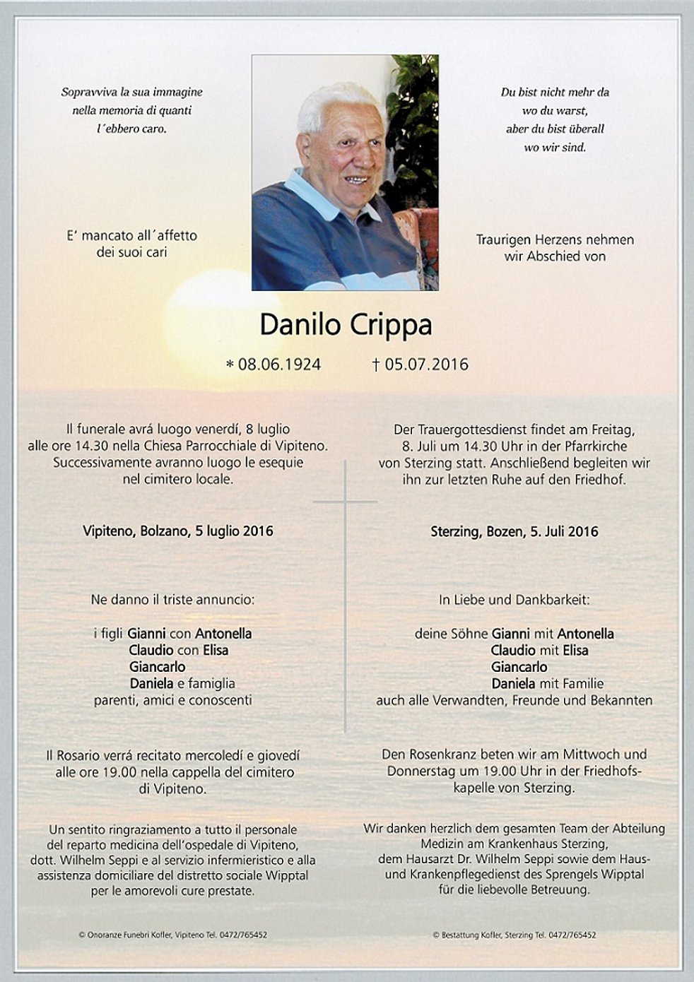 Der Trauergottesdienst findet am Freitag, 8. Juli um 14.30 Uhr in der Pfarrkirche von Sterzing statt. Anschließend begleiten wir ihn zur letzten Ruhe auf den Friedhof.