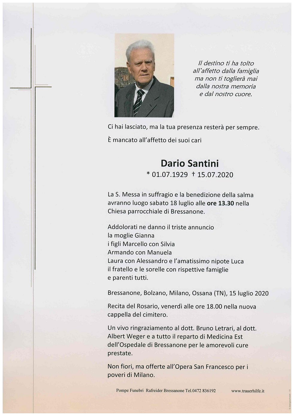 La S. Messa in suffragio e la benedizione della salma avranno luogo sabato 18 luglio alle ore 13.30 nella Chiesa parrocchiale di Bressanone.