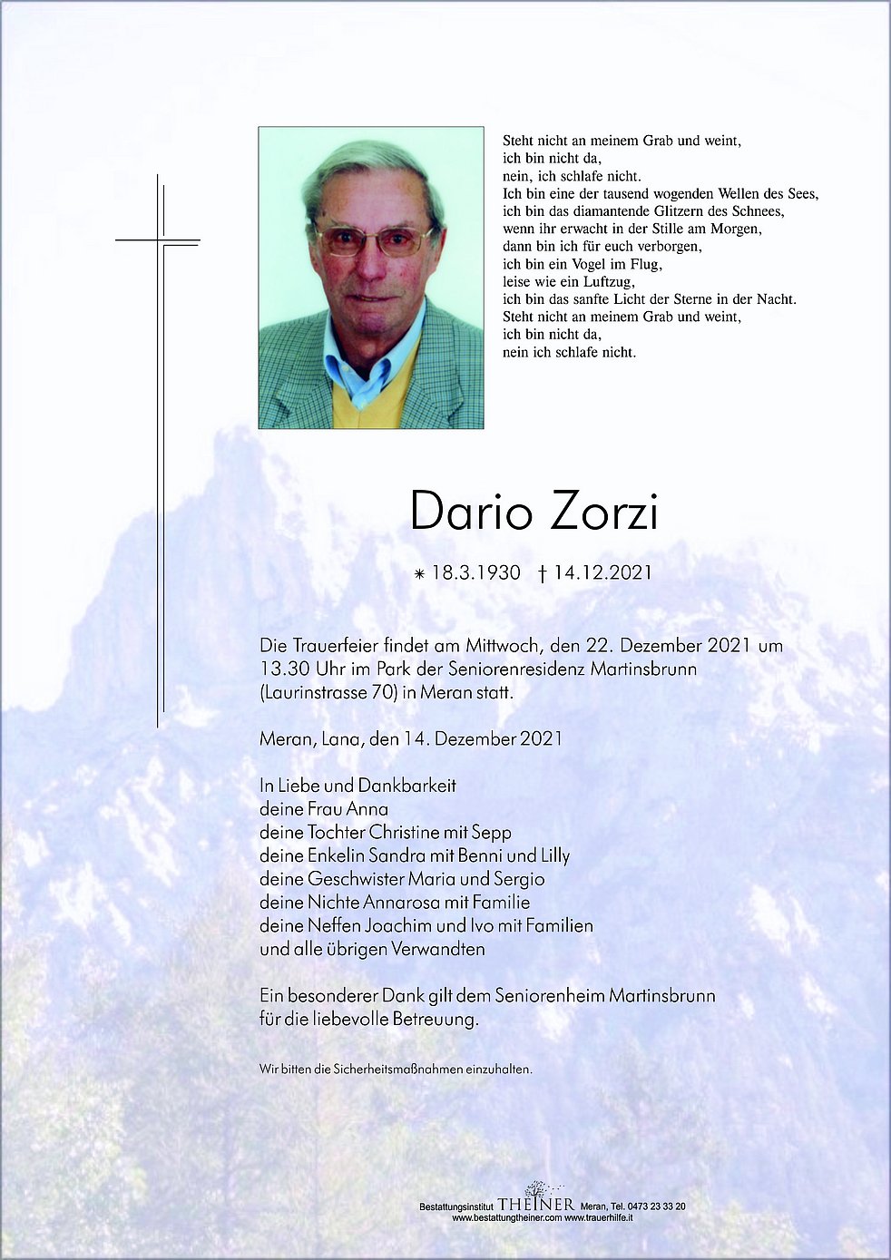 Die Trauerfeier findet am Mittwoch, den 22. Dezember 2021 um 13.30 Uhr im Park der Seniorenresidenz Martinsbrunn (Laurinstrasse 70) in Meran statt.