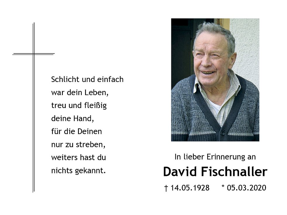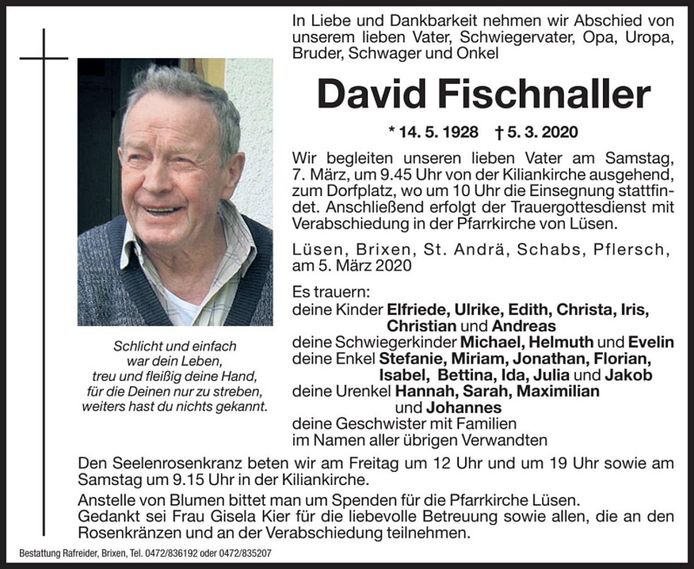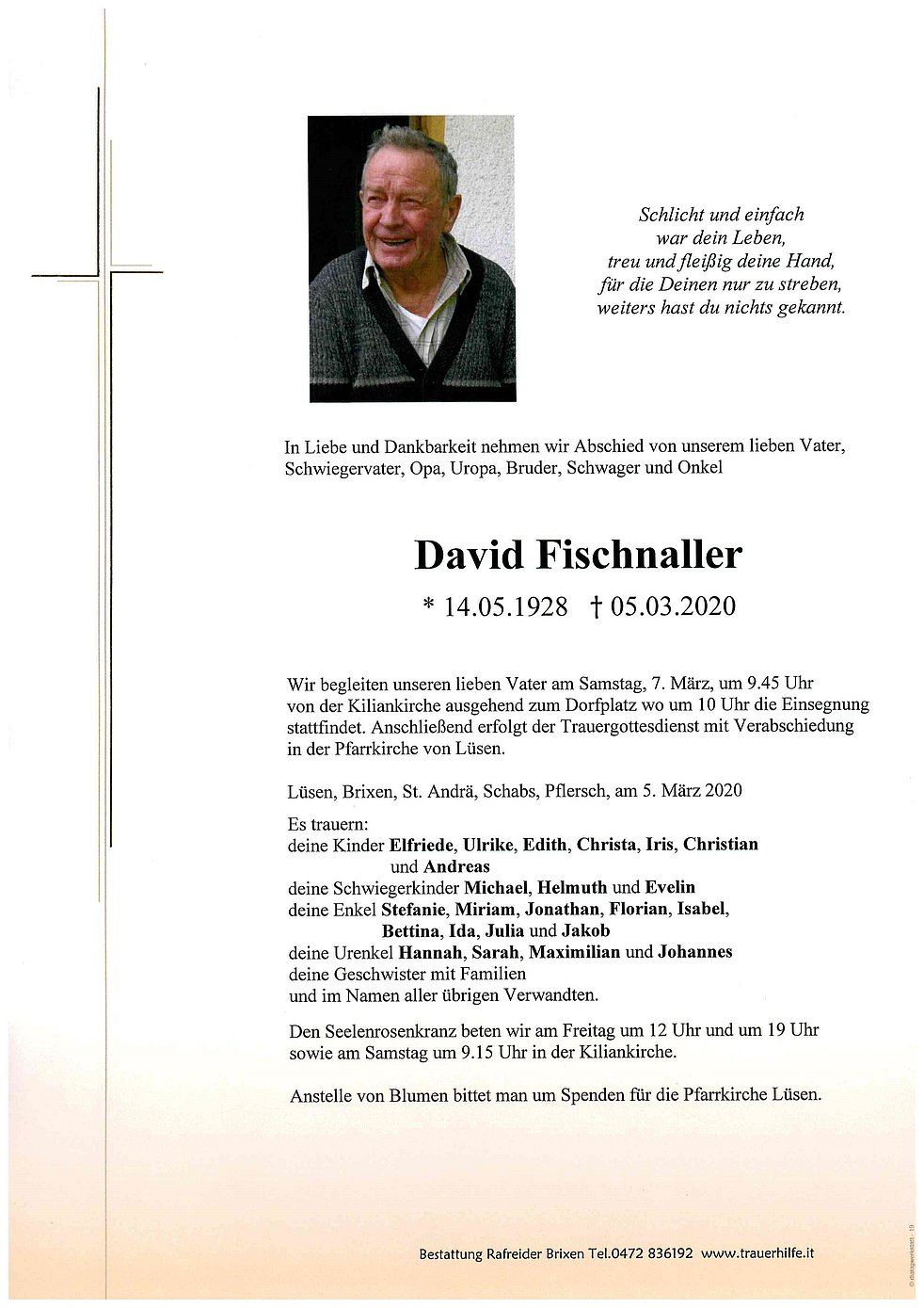 Wir begleiten unseren lieben Vater am Samstag, 7. März, um 9.45 Uhr von der Kiliankirche ausgehend zum Dorfplatz wo um 10 Uhr die Einsegnung stattfindet. Anschließend erfolgt der Trauergottesdienst mit Verabschiedung in der Pfarrkirche von Lüsen.