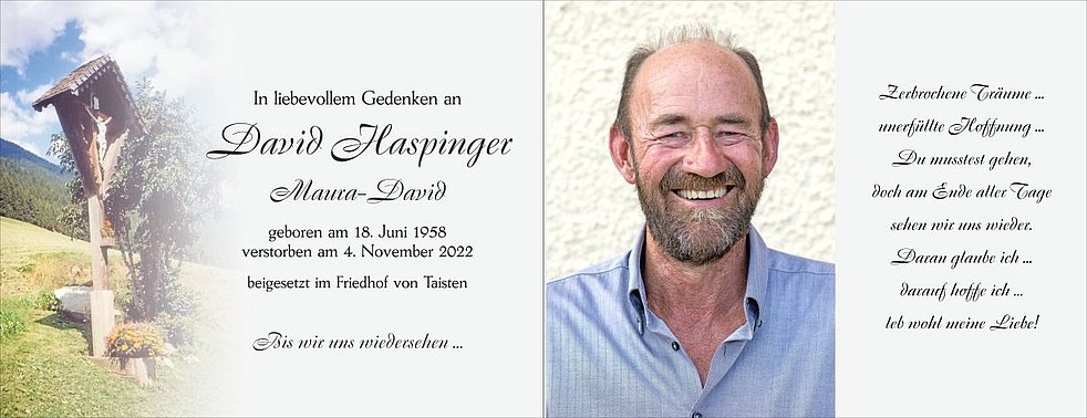 Unser lieber David ist ab Montagmittag in der Jakobskapelle von Taisten aufgebahrt.