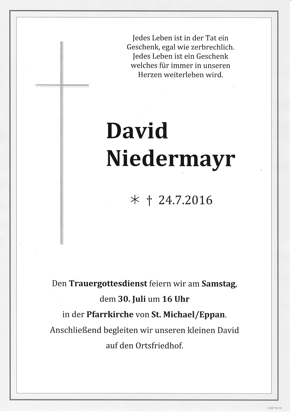 Den Abschiedsgottesdienst feiern wir am Samstag, den 30. Juli, um 16 Uhr in der Pfarrkirche von St. Michael/Eppan. Anschließend begleiten wir unseren kleinen David auf den Ortsfriedhof.