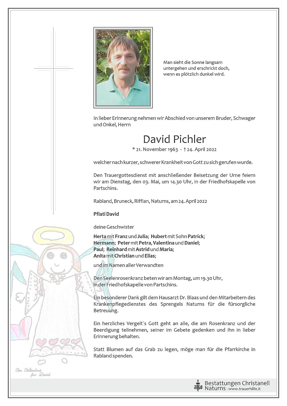 Den Trauergottesdienst mit anschließender Beisetzung der Urne feiern wir am Dienstag, den 03. Mai, um 14.30 Uhr, in der Friedhofskapelle von Partschins.