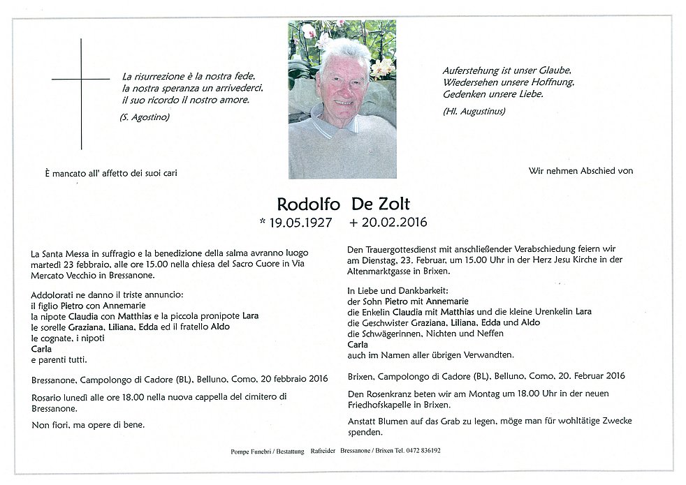 Den Trauergottesdienst mit anschließender Verabschiedung feiern wir am Dienstag, 23. Februar, um 15 Uhr in der Herz Jesu Kirche in der Altenmarktgasse in Brixen.