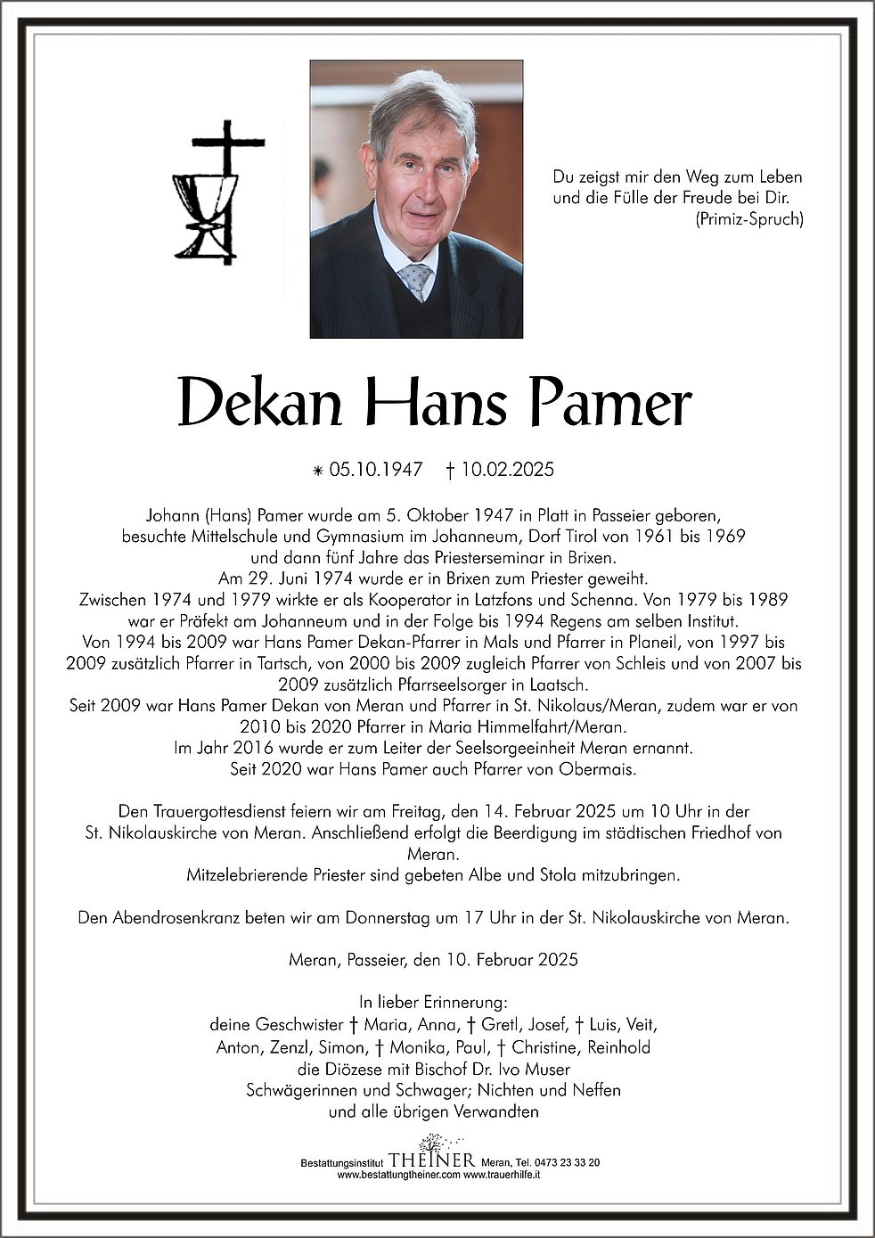 Den Trauergottesdienst feiern wir am Freitag, den 14. Februar 2025 um 10 Uhr in der St. Nikolauskirche von Meran. Anschließend erfolgt die Beerdigung im städtischen Friedhof von Meran.