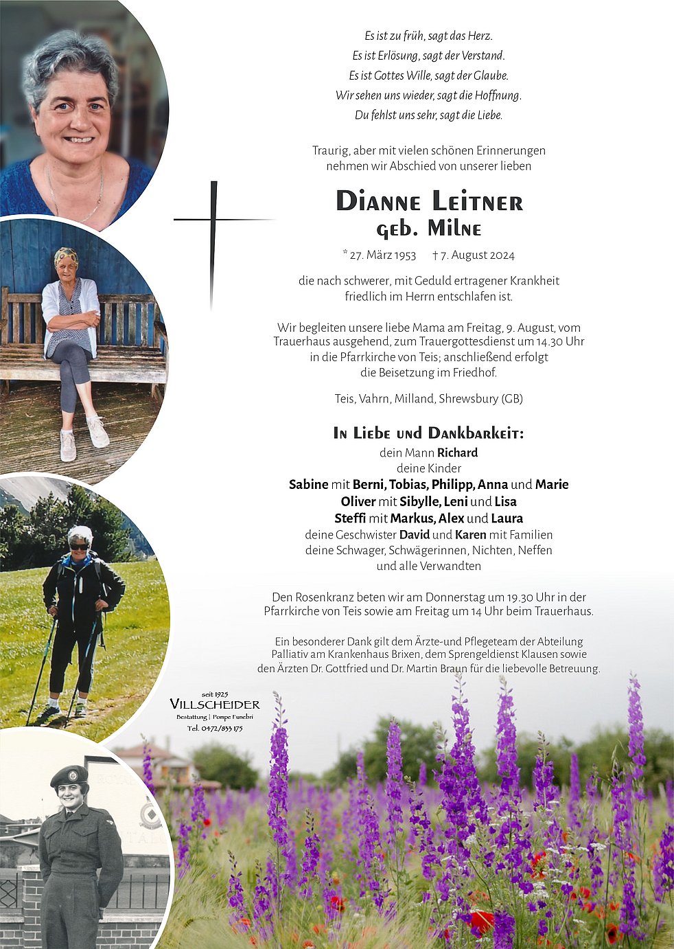 Lieber Richard, liebe Sabine, Olli und Steffi mit Familien, mit grosser Traurigkeit im Herzen mussten wir vom Heimgang eurer geliebten Frau/Mama erfahren. Obwohl wir vorbereitet waren ist der Verlust sehr schmerzhaft und macht uns traurig. Wir haben eine jahrzehntelange Freundschaft mit Dianne und ihrer Familie gepflegt und haben sie wegen ihrer Liebenswürdigkeit in unser Herz geschlossen.