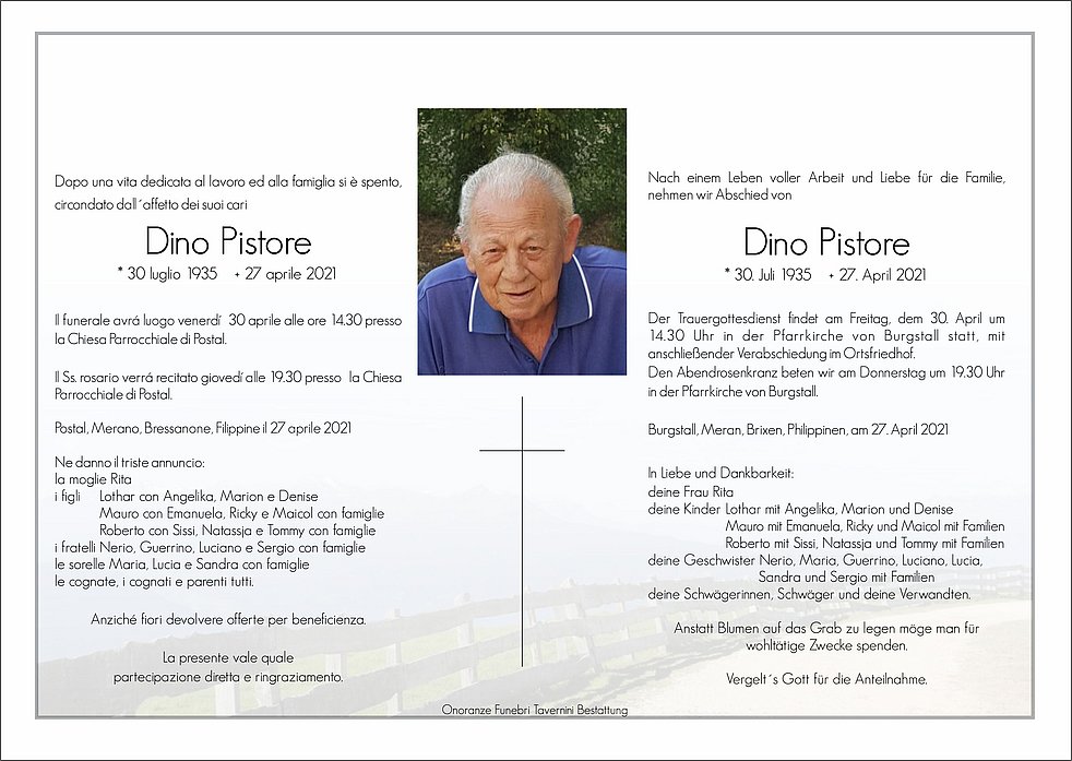 Ciao caro fratello Dino! Sarai sempre nel mio cuore! Alla Rita e Famiglie sincere condoglianze. Luciano e Erna.