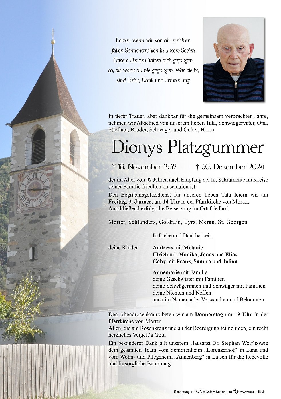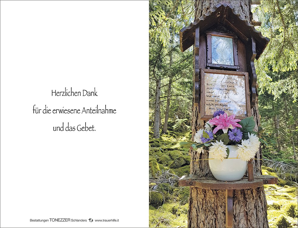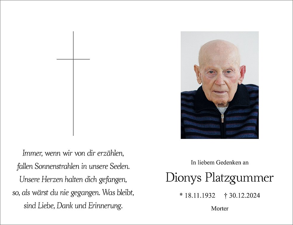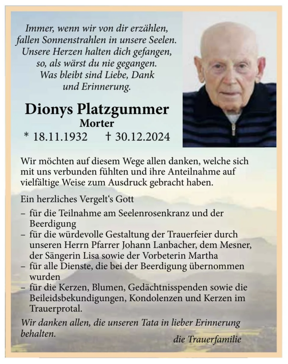 Grod vor a poor Tog ban an kloanen Spaziergong, a Begnung, a kloaner Plausch, asnondergongen mitn Wissn, dass eis Obschiednemmeniasst va enkern Tata u s'Versprechn zu betn. Iaz isch er afn Hoamweg zun Himml. Möge er olle seine Liabm wiedersechn und Ruhe findn in der ewigen Freude u im Liacht Gottes. Enk soll der Glabm an die Auferstehung Kroft u Trost schenkn u s'Gebet va viele Leit soll enk dia traurige Zeit leichter mochn. I winsch enk mitfühlende Begleiter an enkerer Seite u an feschtn Zoomenholt.in der Familie.