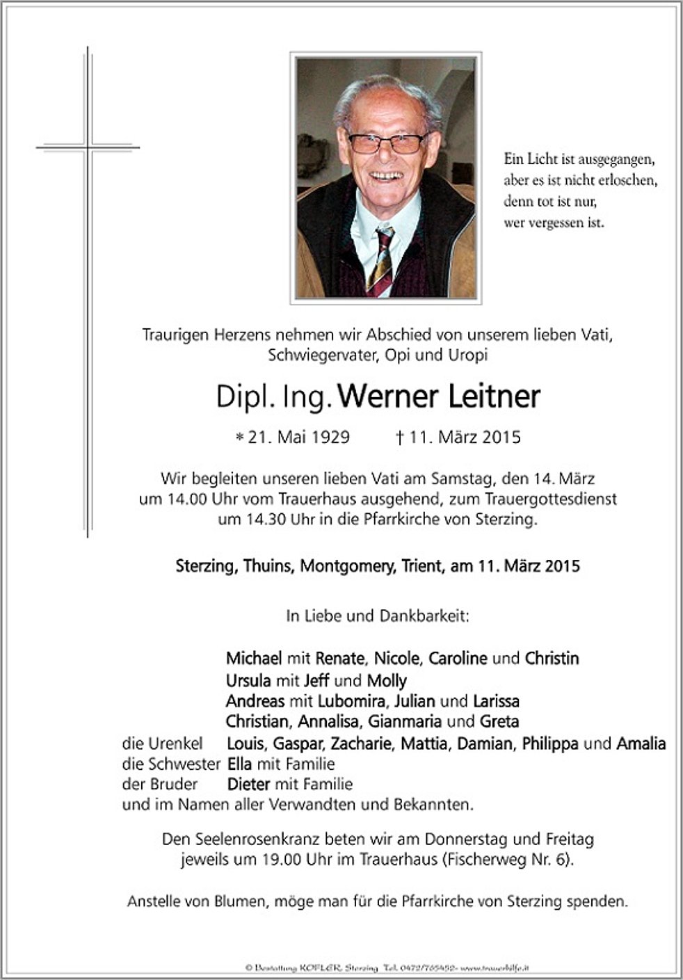 Anstelle von Blumen, möge man für die Pfarrkirche von Sterzing spenden.