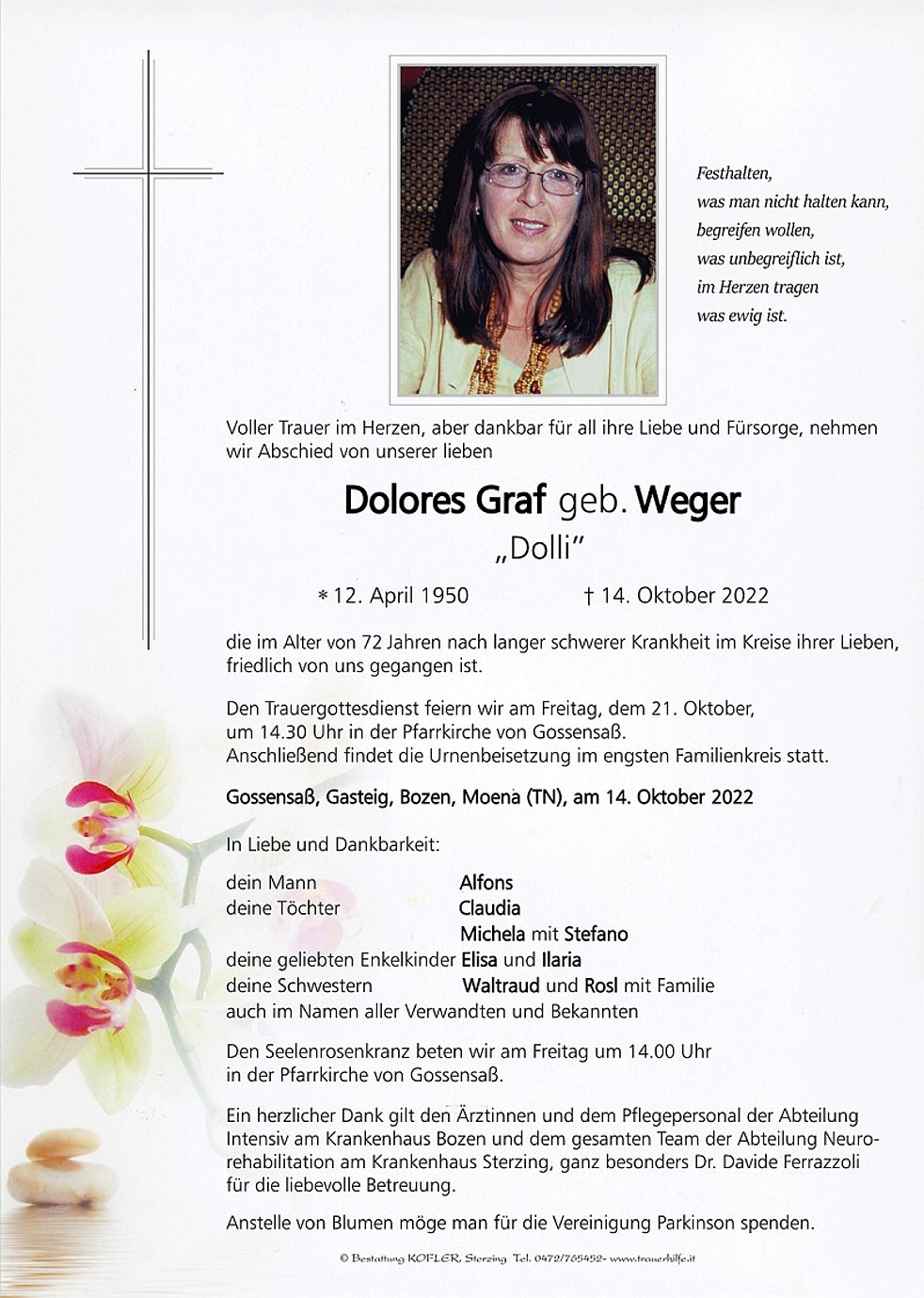 Den Trauergottesdienst feiern wir am Freitag, dem 21. Oktober, um 14.30 Uhr in der Pfarrkirche von Gossensaß. Anschließend findet die Urnenbeisetzung im engsten Familienkreis statt.