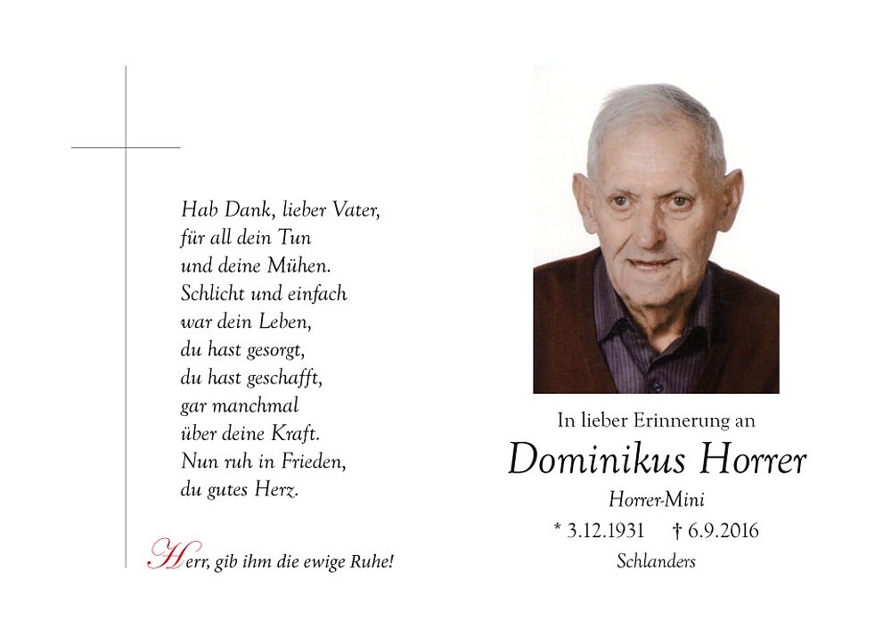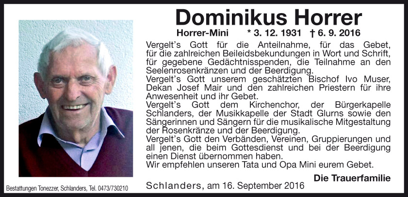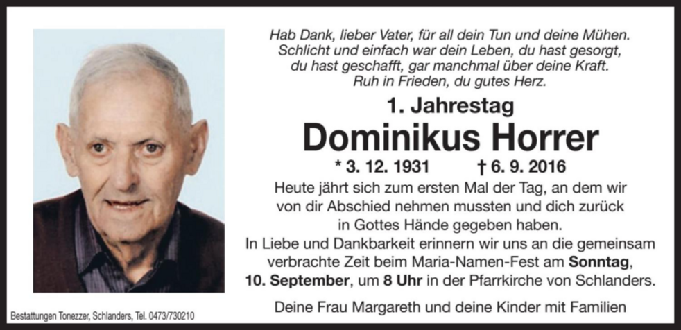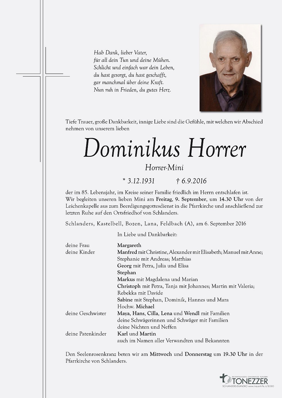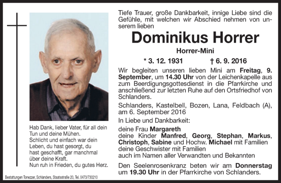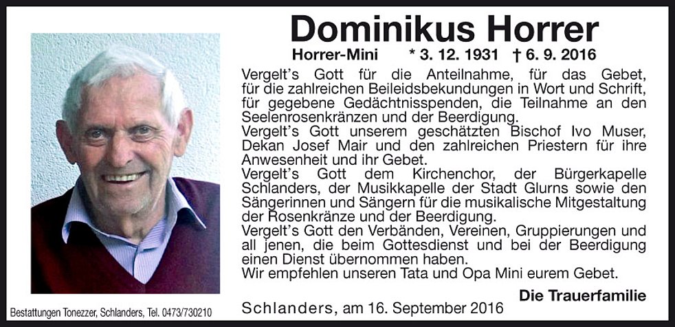 Wir begleiten unseren lieben Mini am Freitag, 9. September, um 14.30 Uhr von der Leichenkapelle aus zum Beerdigungsgottesdienst in die Pfarrkirche und anschließend zur letzten Ruhe auf den Ortsfriedhof von Schlanders.