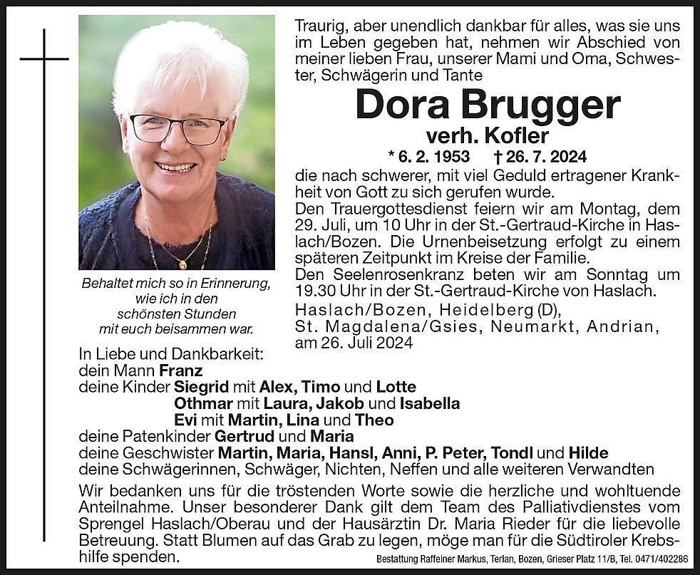 Den Trauergottesdienst feiern wir am Montag, dem 29. Juli, um 10 Uhr in der St.-Gertraud-Kirche in Haslach/ Bozen.