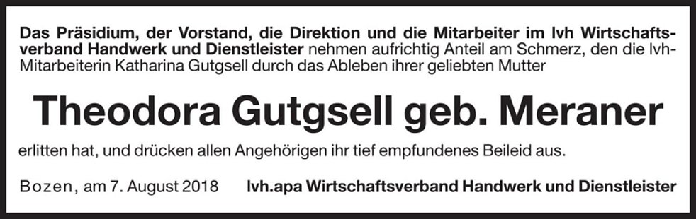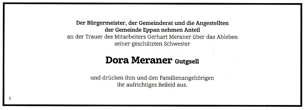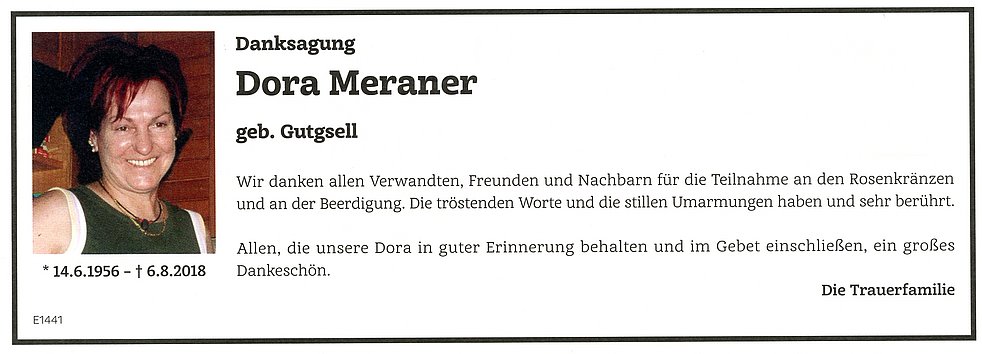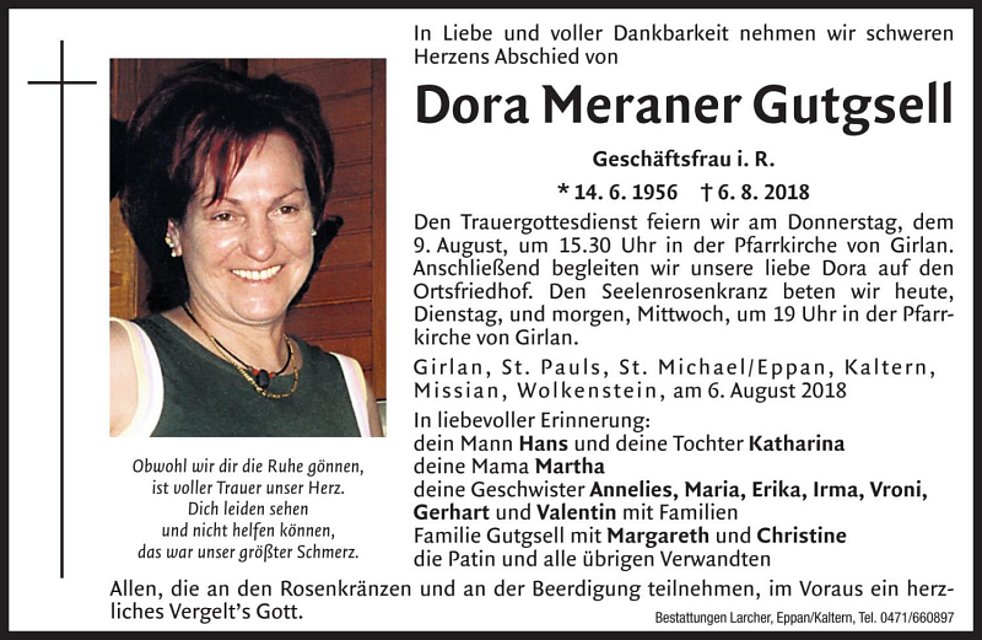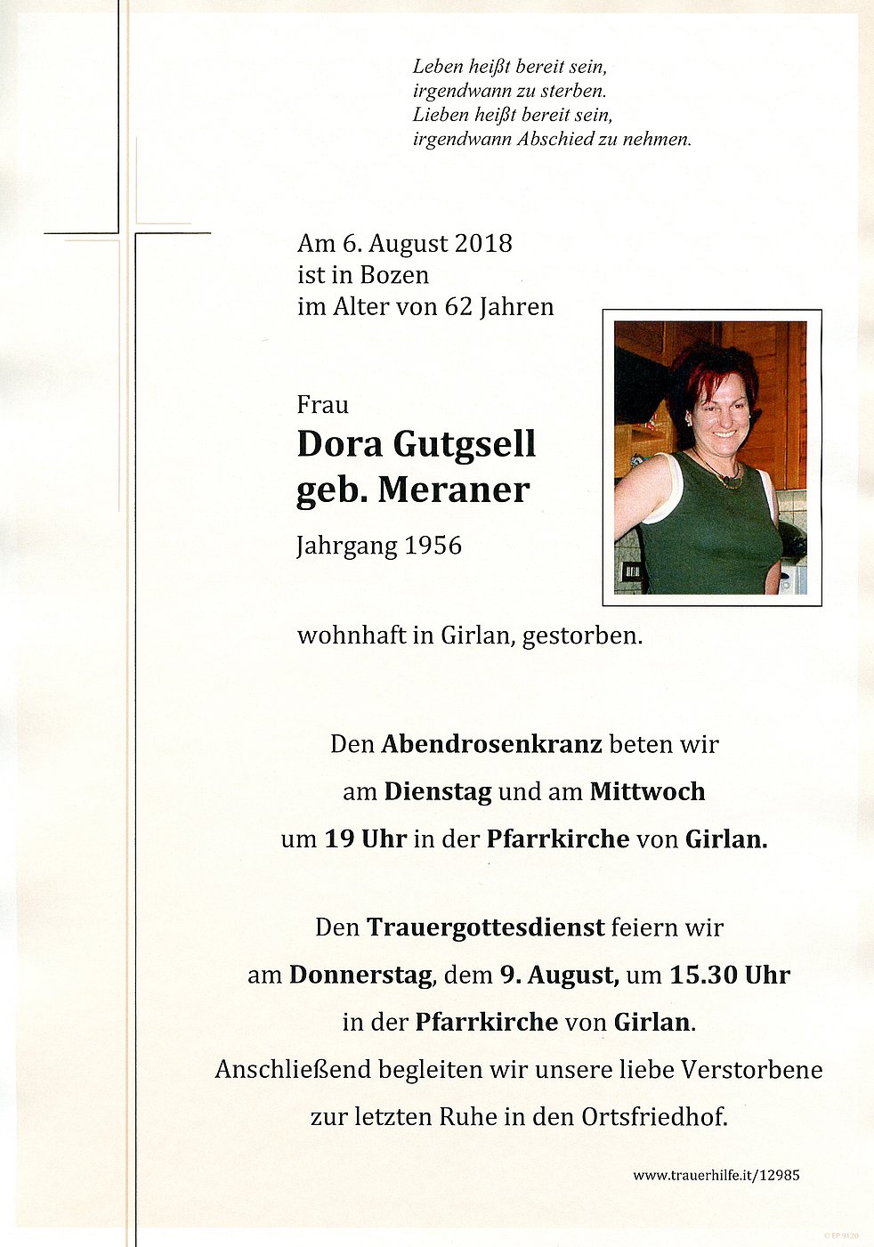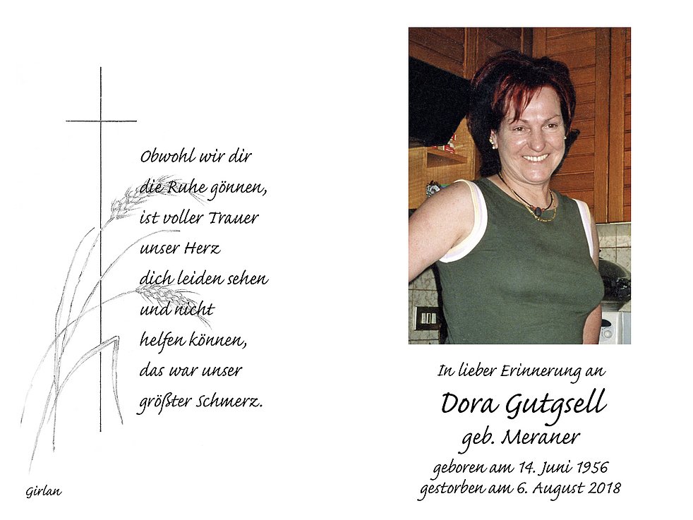 Den Trauergottesdienst feiern wir am Donnerstag, dem 9. August um 15.30 Uhr in der Pfarrkirche von Girlan. Anschließend begleiten wir unsere liebe Dora auf den Ortsfriedhof. Den Seelenrosenkranz beten wir am Dienstag und am Mittwoch um 19 Uhr in der Pfarrkirche von Girlan.