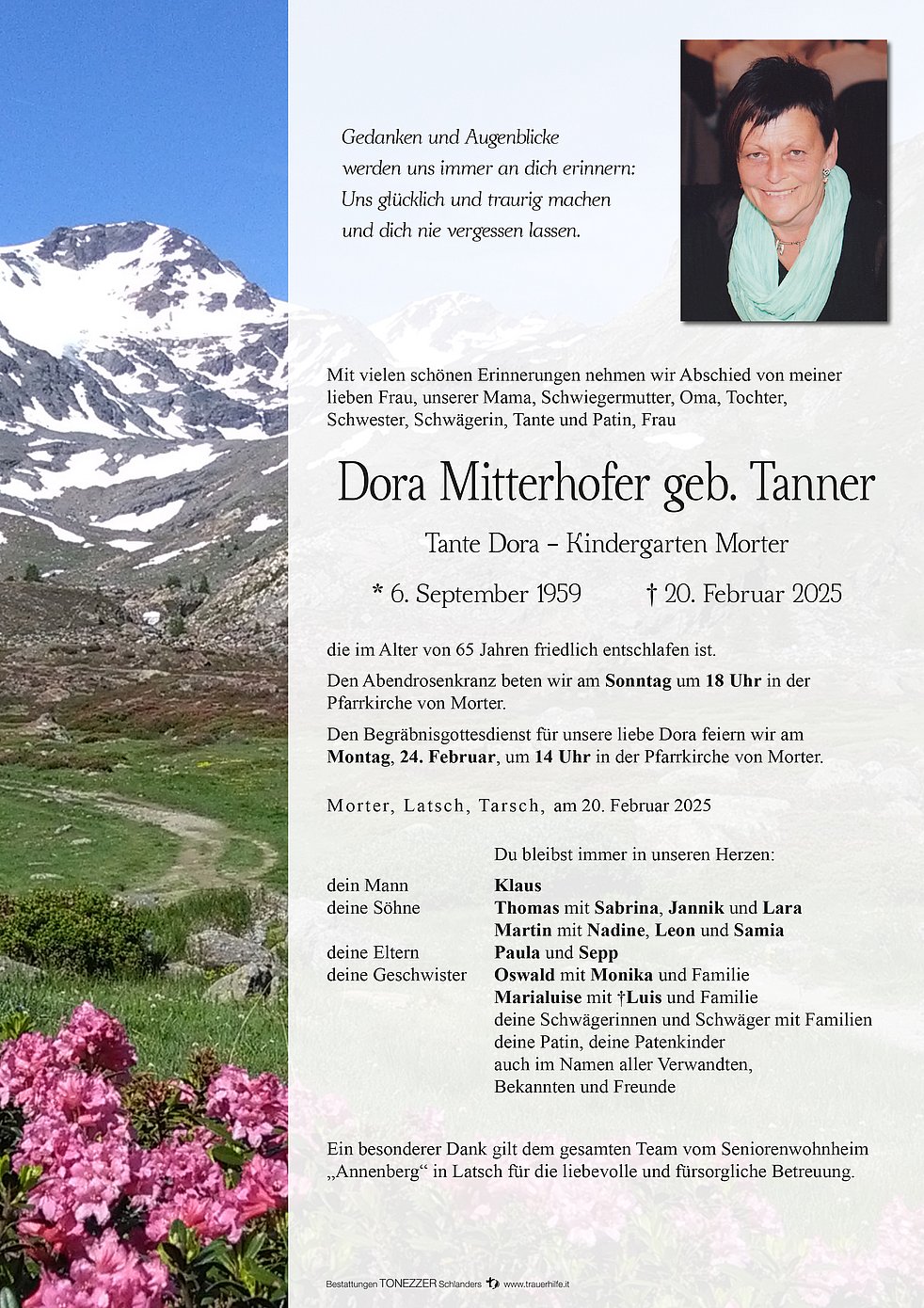 dass die Tante Dora nun im Lichte und in der liebe Gottes geborgen ist, sei euch Trost, Kraft und Zuversicht. Uanmol segn mir ins wieder!