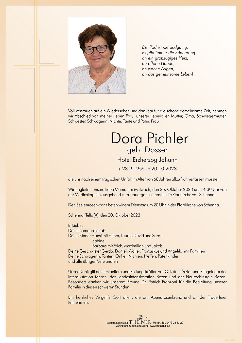 Wir begleiten unsere liebe Mama am Mittwoch, den 25. Oktober 2023 um 14.30 Uhr von der Martinskapelle ausgehend zum Trauergottesdienst in die Pfarrkirche von Schenna.