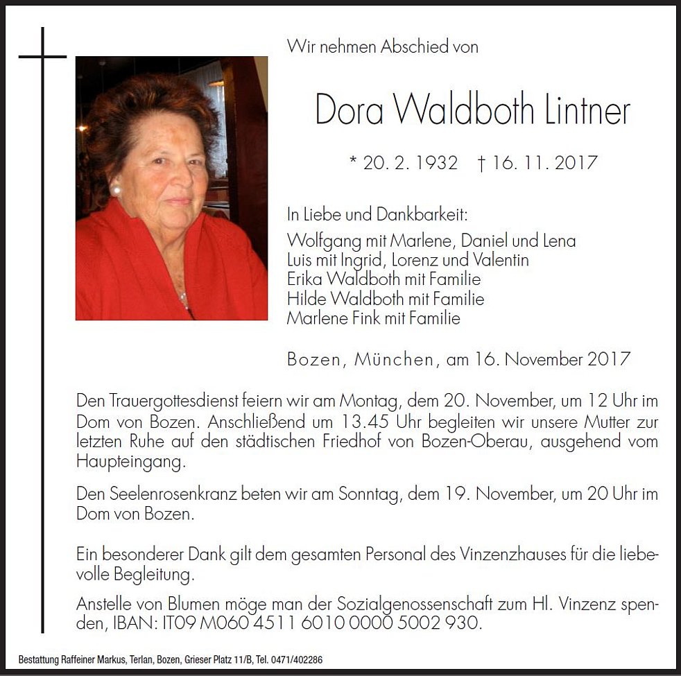 Den Trauergottesdienst feiern wir am Montag, dem 20. November, um 12 Uhr im Dom von Bozen. Anschlieβend um 13.45 Uhr begleiten wir unsere Mutter zur letzten Ruhe auf den städtischen Friedhof von Bozen-Oberau, ausgehend vom Haupteingang.