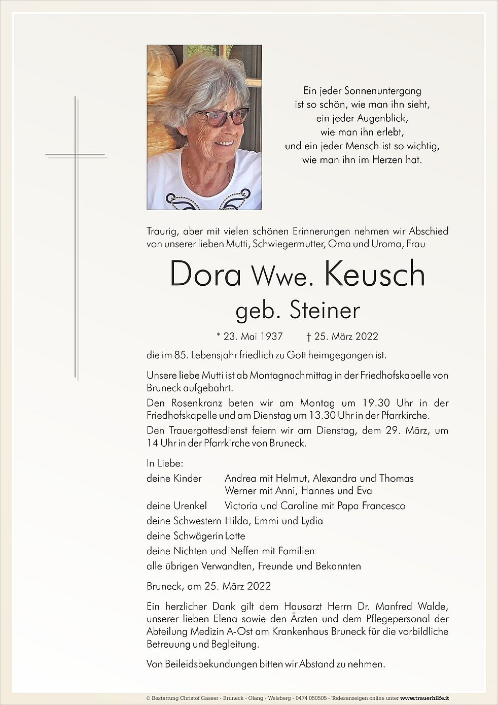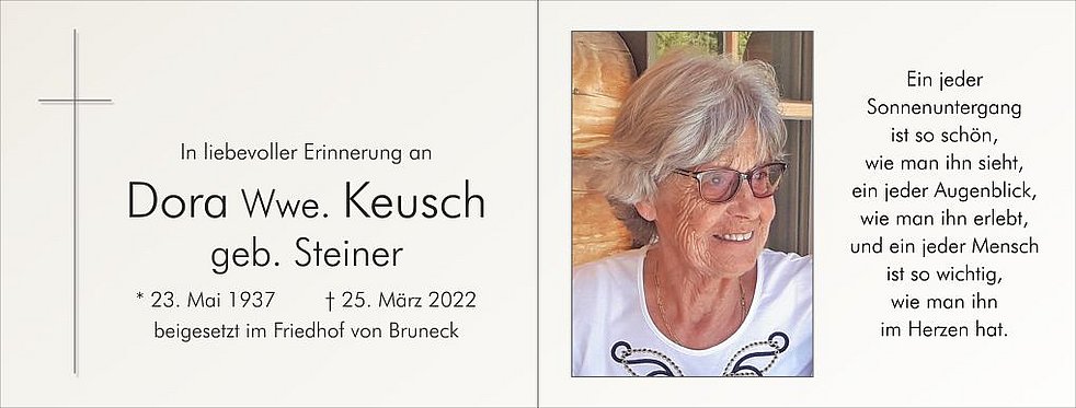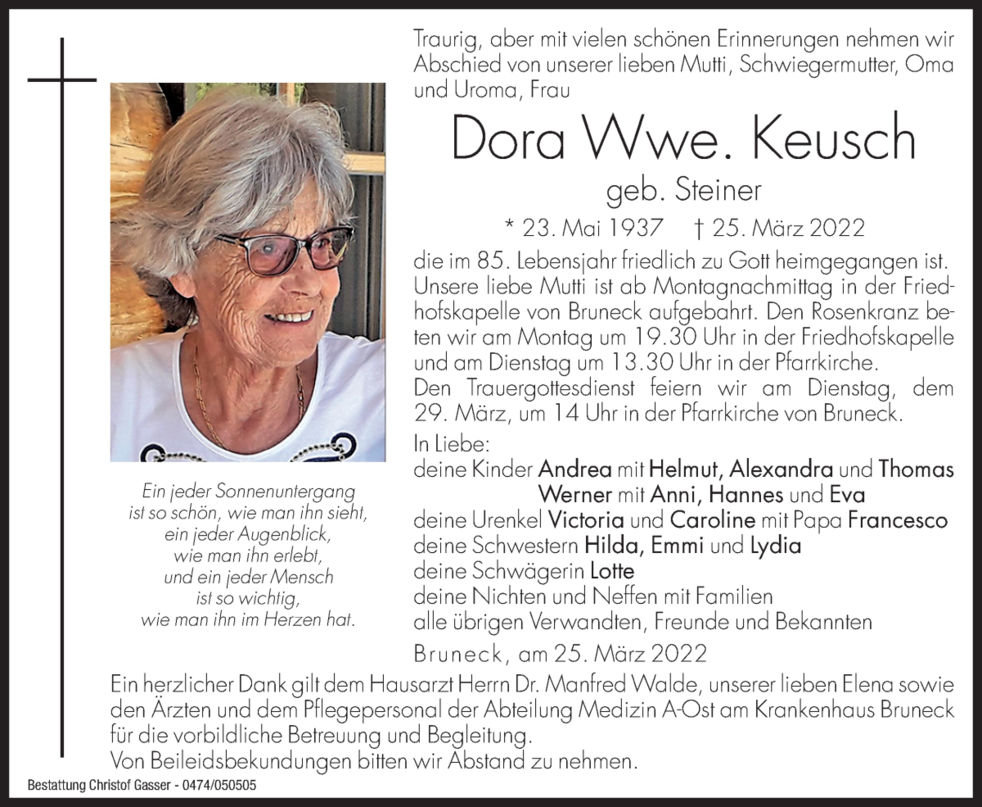Den Trauergottesdienst feiern wir am Dienstag, dem 29. März, um 14 Uhr in der Pfarrkirche von Bruneck.