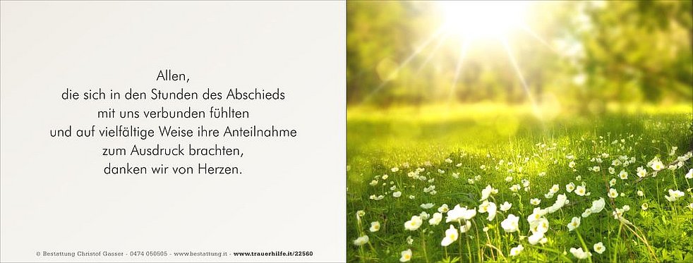 Ein herzlicher Dank gilt dem Hausarzt Herrn Dr. Manfred Walde, unserer lieben Elena sowie den Ärzten und dem Pflegepersonal der Abteilung Medizin A-Ost am Krankenhaus Bruneck für die vorbildliche Betreuung und Begleitung.