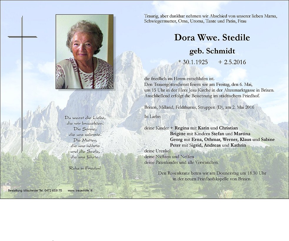 Traurig, aber dankbar nehmen wir Abschied von unserer lieben Mama, Schwiegermutter, Oma, Uroma, Tante und Patin, Frau