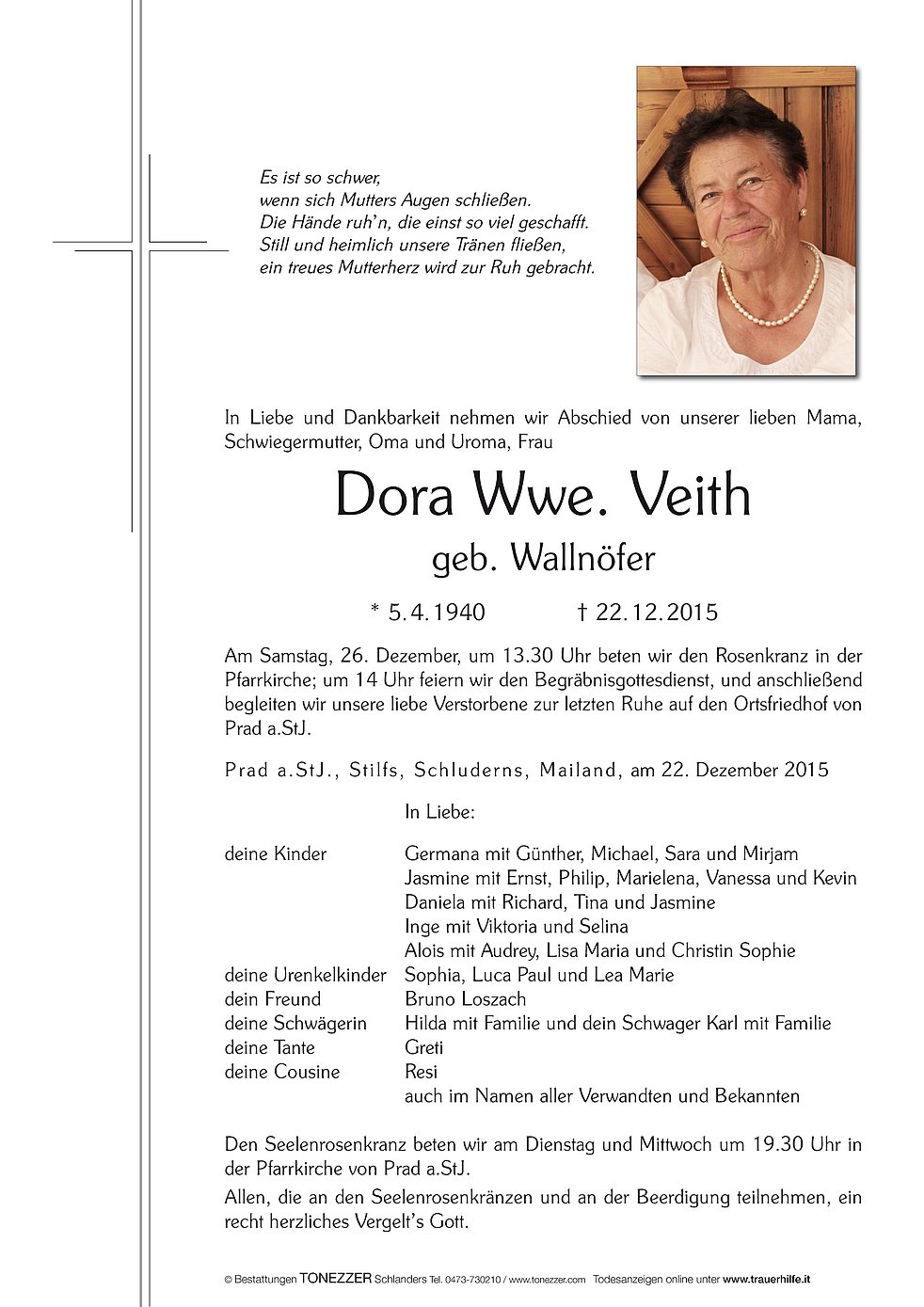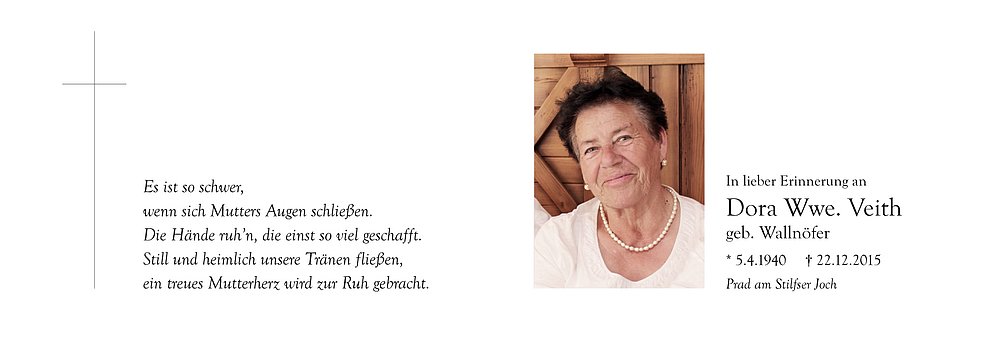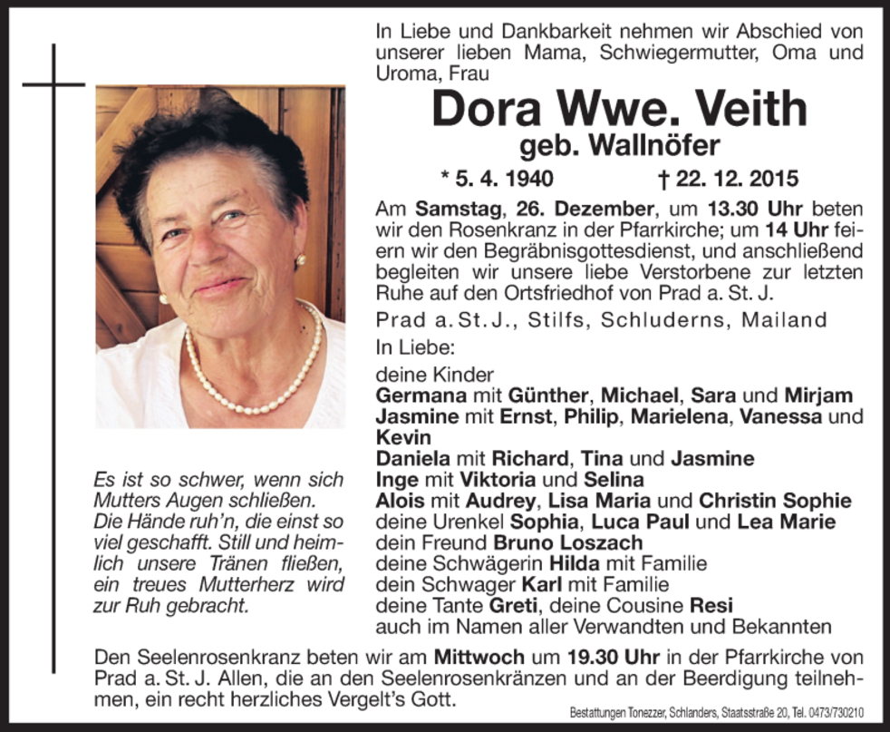 Am Samstag, 26. Dezember, um 13.30 Uhr beten wir den Rosenkranz in der Pfarrkirche; um 14 Uhr feiern wir den Begräbnisgottesdienst, und anschließend begleiten wir unsere liebe Verstorbene zur letzten Ruhe auf den Ortsfriedhof von Prad a.StJ.