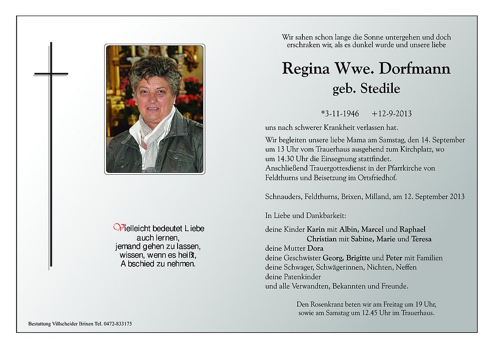 Wir begleiten unsere liebe Mama am Samstag, den 14. September um 13 Uhr vom Trauerhaus ausgehend zum Kirchplatz, wo