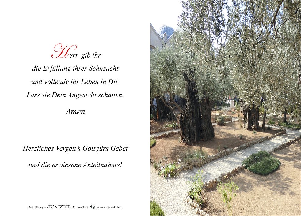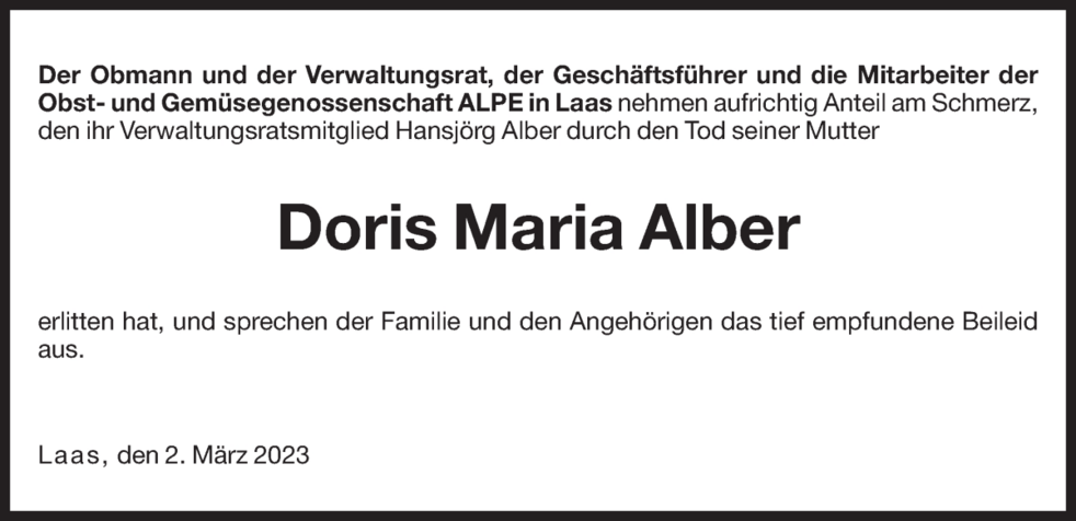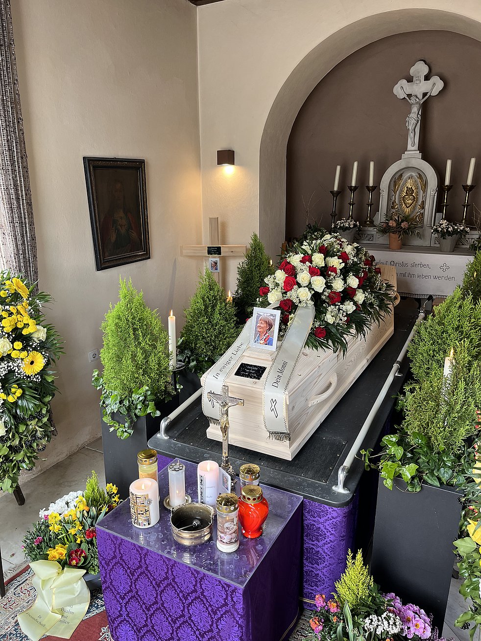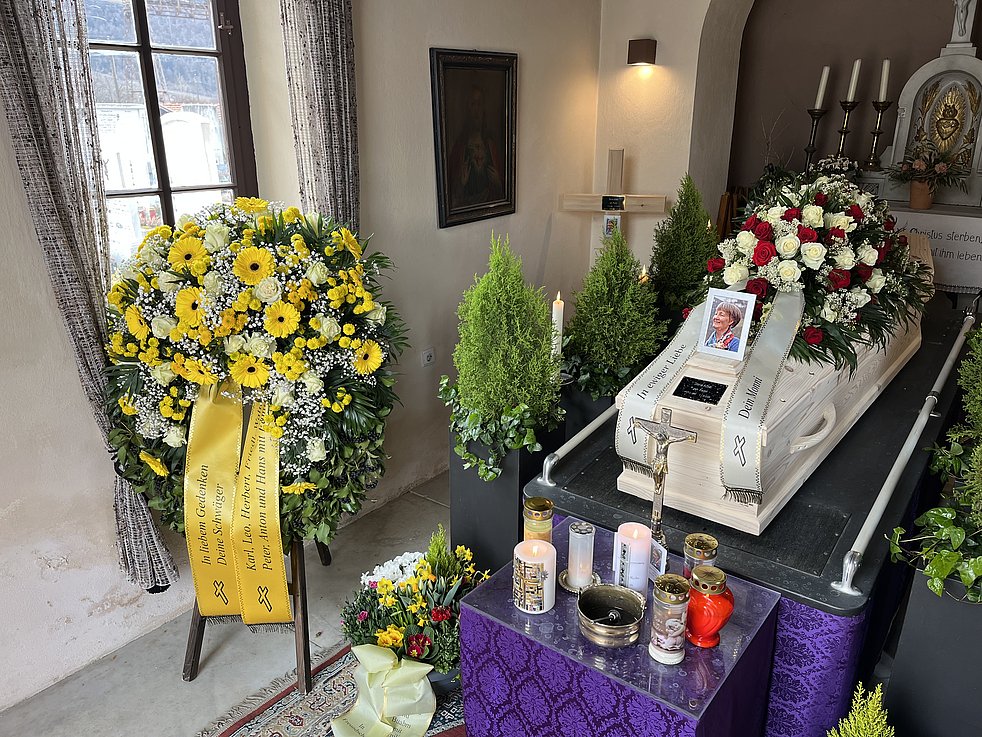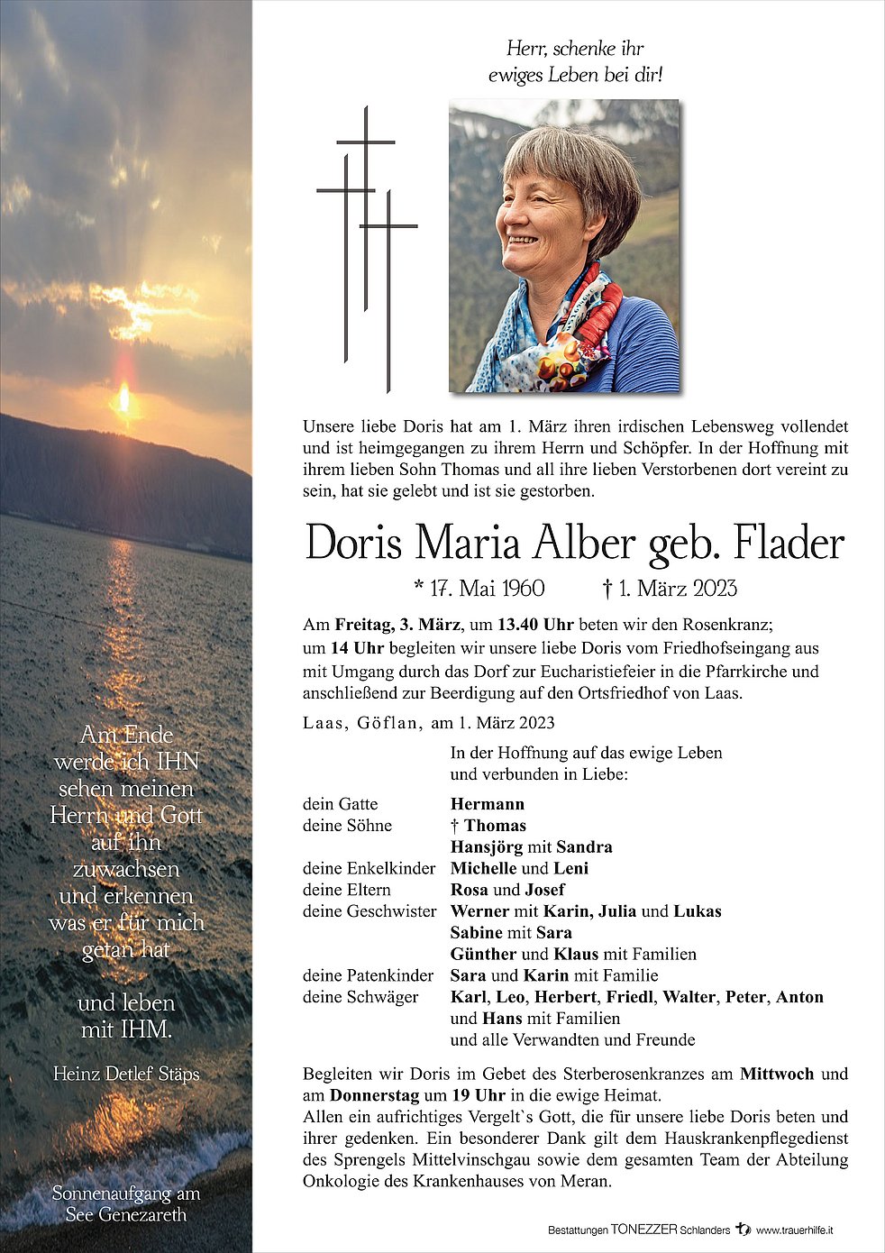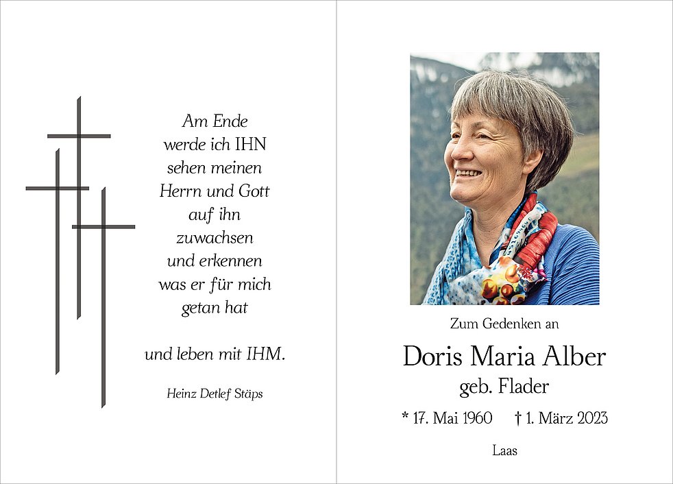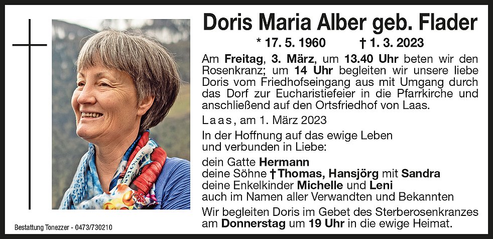 Am Freitag, 3. März, um 13.40 Uhr beten wir den Rosenkranz; um 14 Uhr begleiten wir unsere liebe Doris vom Friedhofseingang aus mit Umgang durch das Dorf zur Eucharistiefeier in die Pfarrkirche und anschließend zur Beerdigung auf den Ortsfriedhof von Laas.