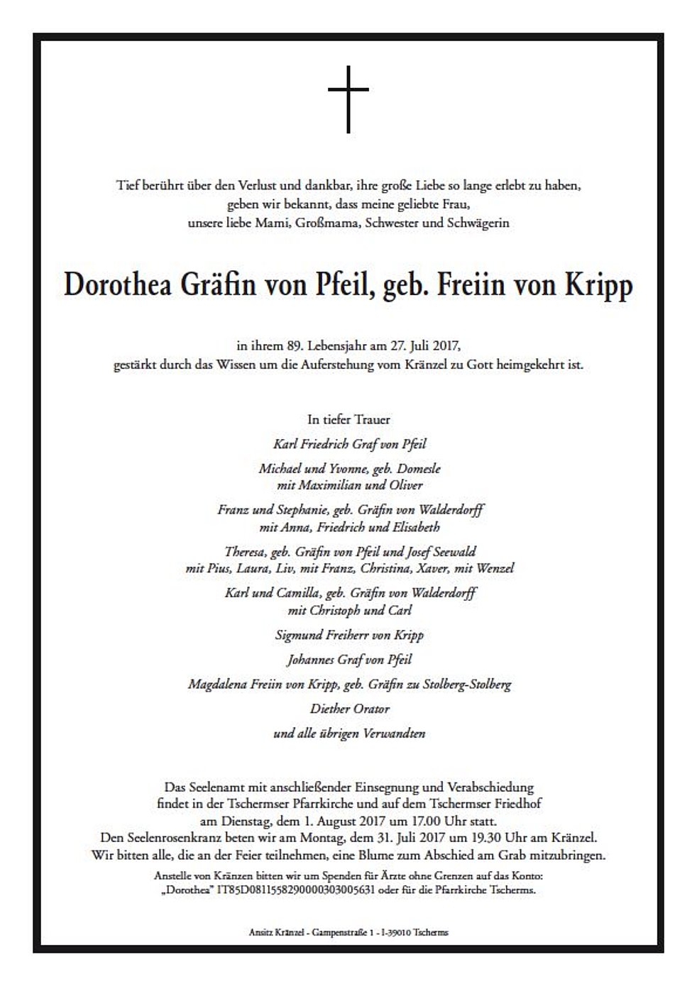 Das Seelenamt mit anschließender Einsegnung und Verabschiedung findet in der Tschermser Pfarrkirche und auf dem Tschermser Friedhof am Dienstag, dem 1. August 2017 um 17.00 Uhr statt.