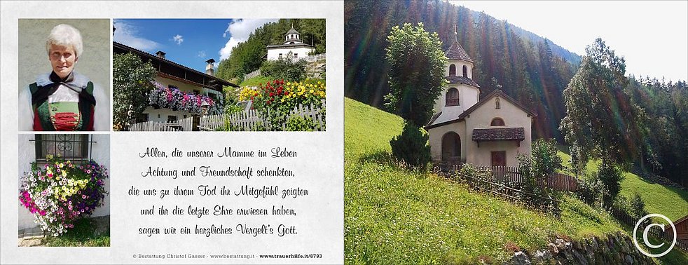 Ein besonderer Dank gilt unserer Hausärztin, den behandelnden Ärzten und dem Pflegepersonal am Krankenhaus Bruneck sowie dem Team von der Langzeitpflege vom Wohn - und Pflegeheim Bruneck.