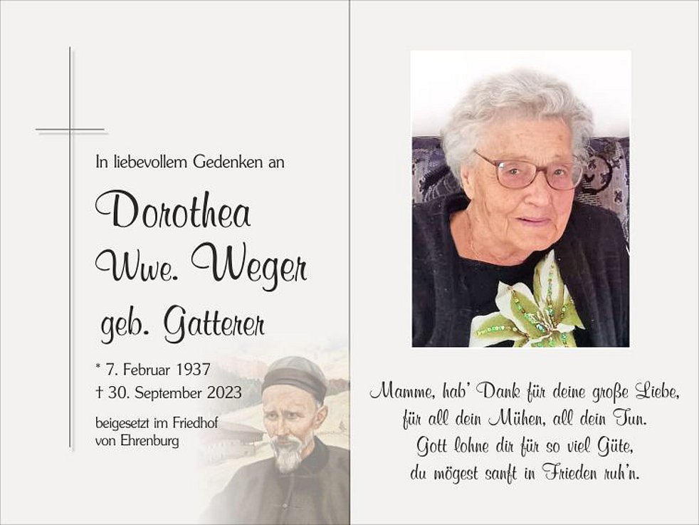 Dankbar für die lange schöne Zeit, die wir gemeinsam erleben durften, nehmen wir Abschied von unserer lieben Mamme, Schwiegermutter, Oma und Uroma, Frau