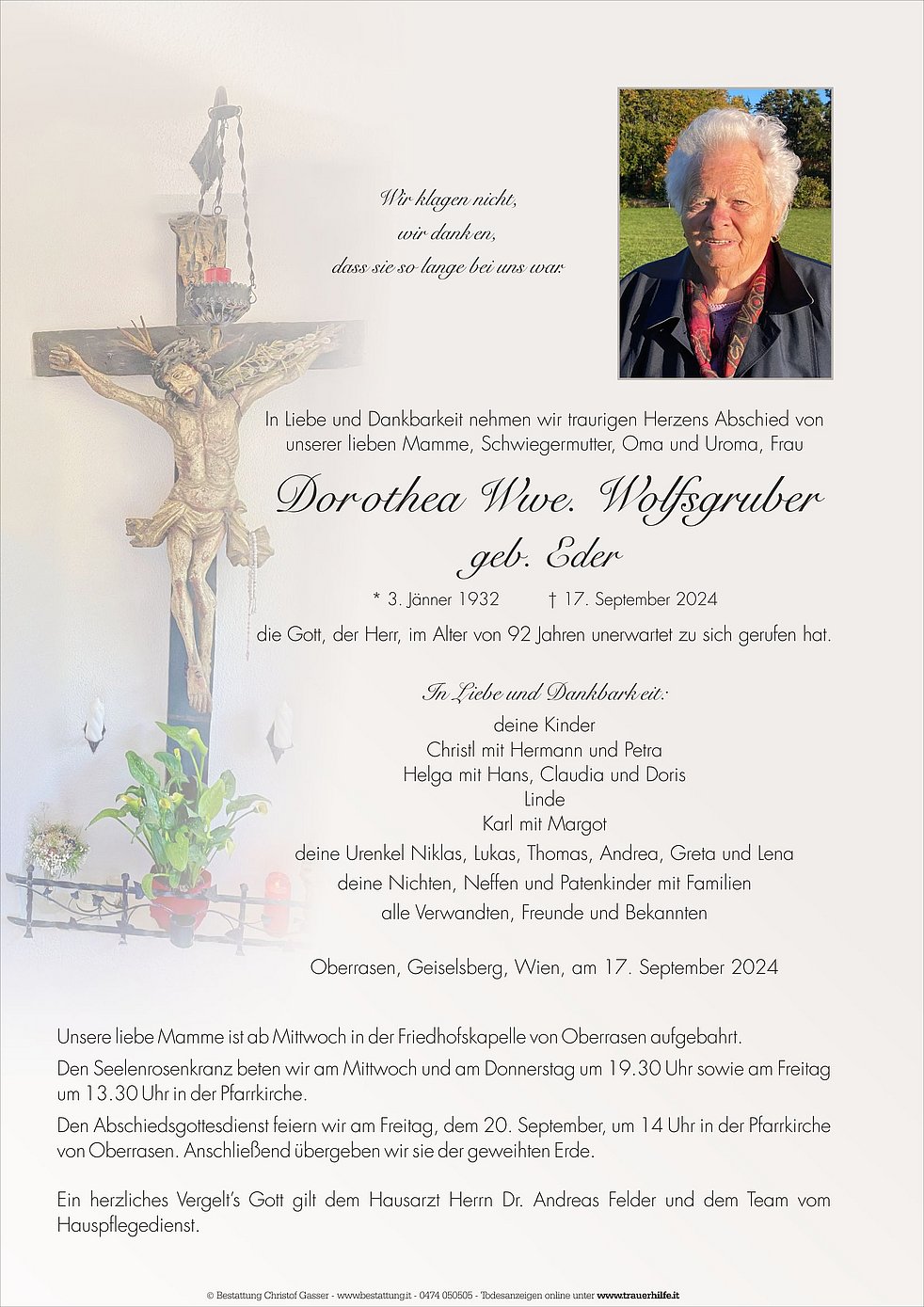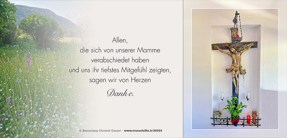 Unsere liebe Mamme ist ab Mittwoch in der Friedhofskapelle von Oberrasen aufgebahrt.