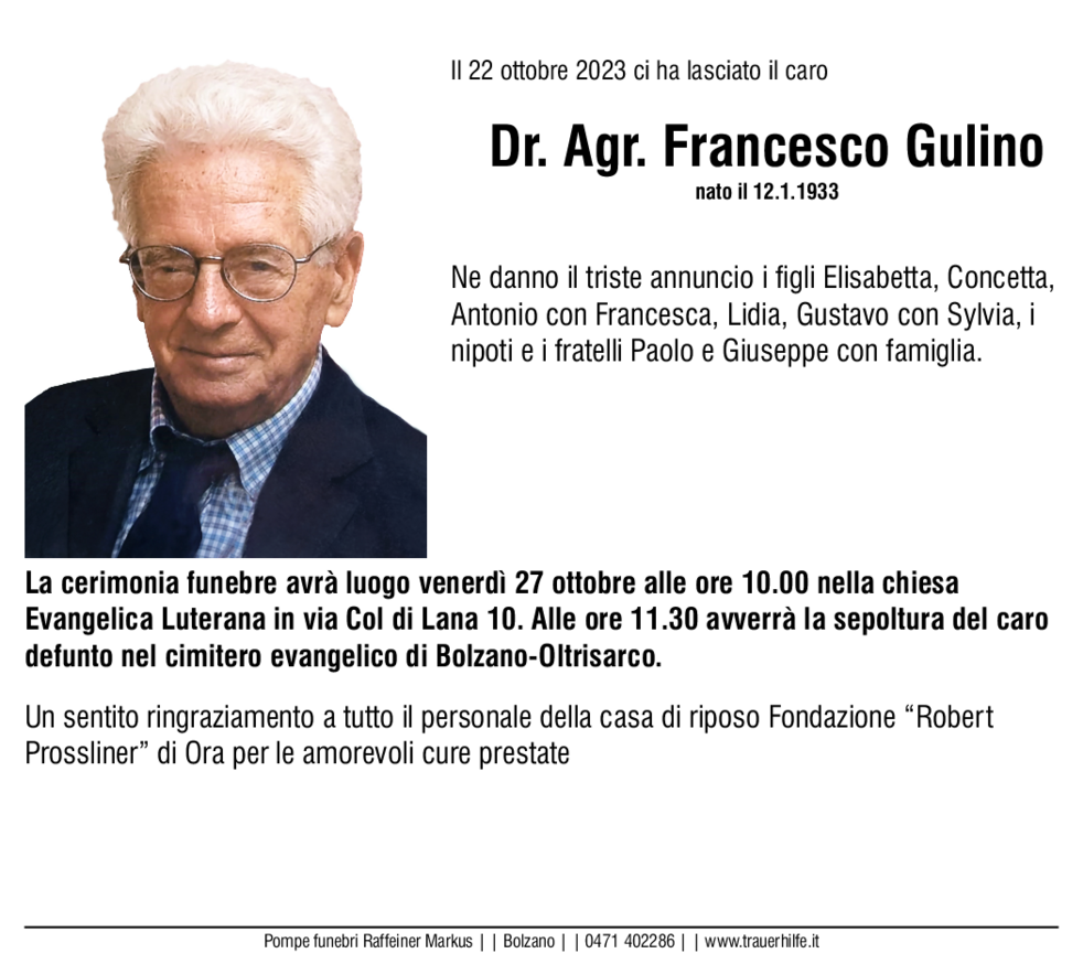 La cerimonia funebre avrà luogo venerdì 27 ottobre alle ore 10.00 nella chiesa Evangelica Luterana in via Col di Lana 10. Alle ore 11.30 avverrà la sepoltura del caro defunto nel cimitero evangelico di Bolzano-Oltrisarco.